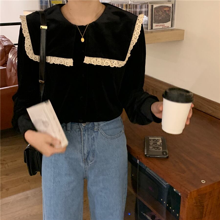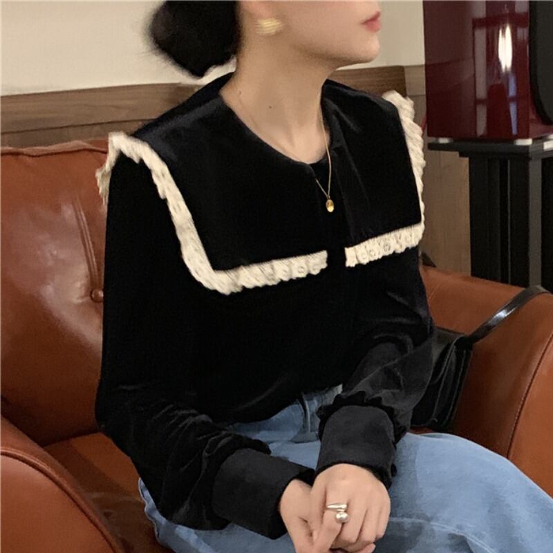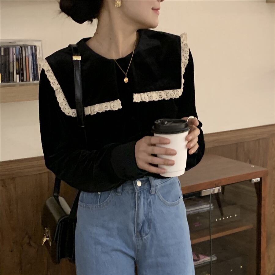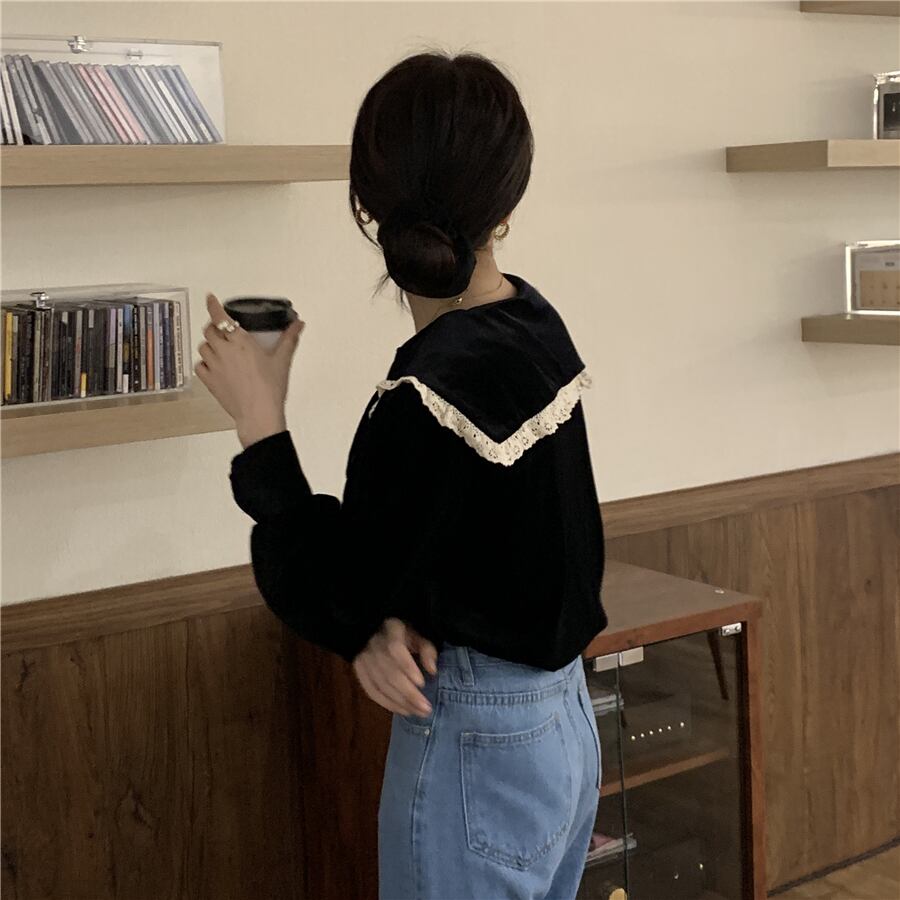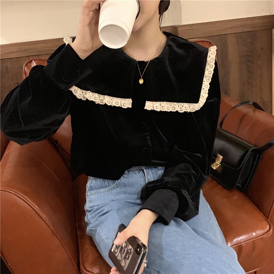 オータムレースネイビーカラー長袖スリーブブラックベルベットシャツ レディース ロング 秋物 ステッチ 韓国婦人10795624489