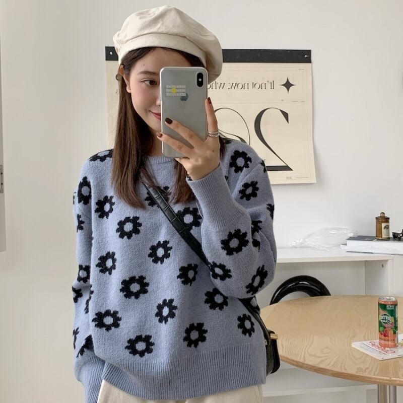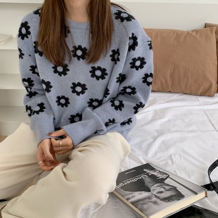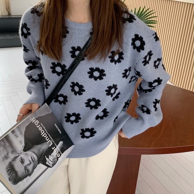 スタイルFlowerデザイン パターンラウンドネックルーズ薄手セーター レディース ロング Oネック フラワーデザイン 韓国婦人83863459810