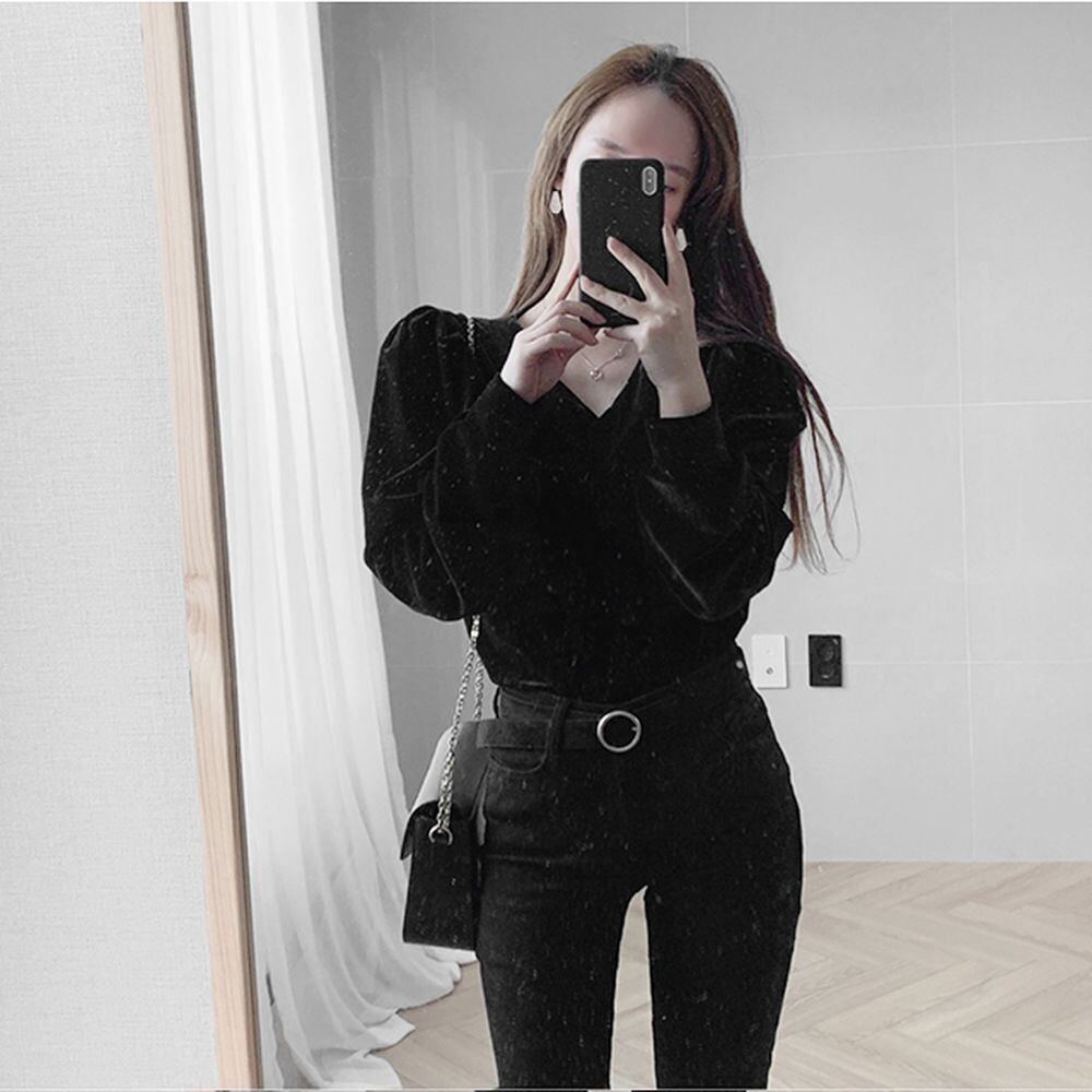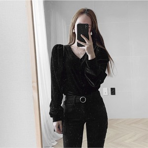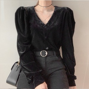 スリーブVネック薄手トップス スプリングゴールドベルベットシャツ レディース 春物 韓国婦人90280763932