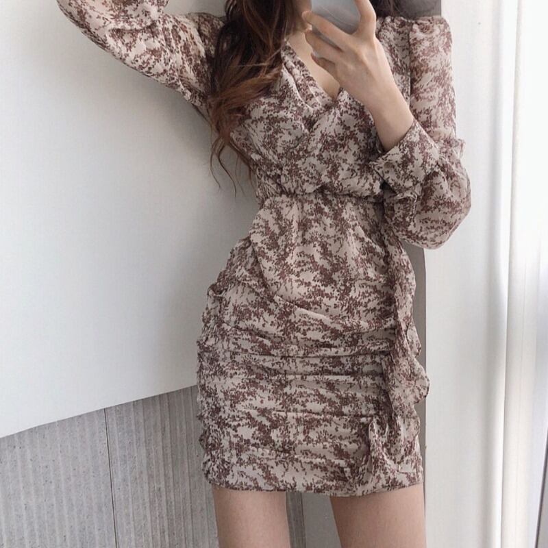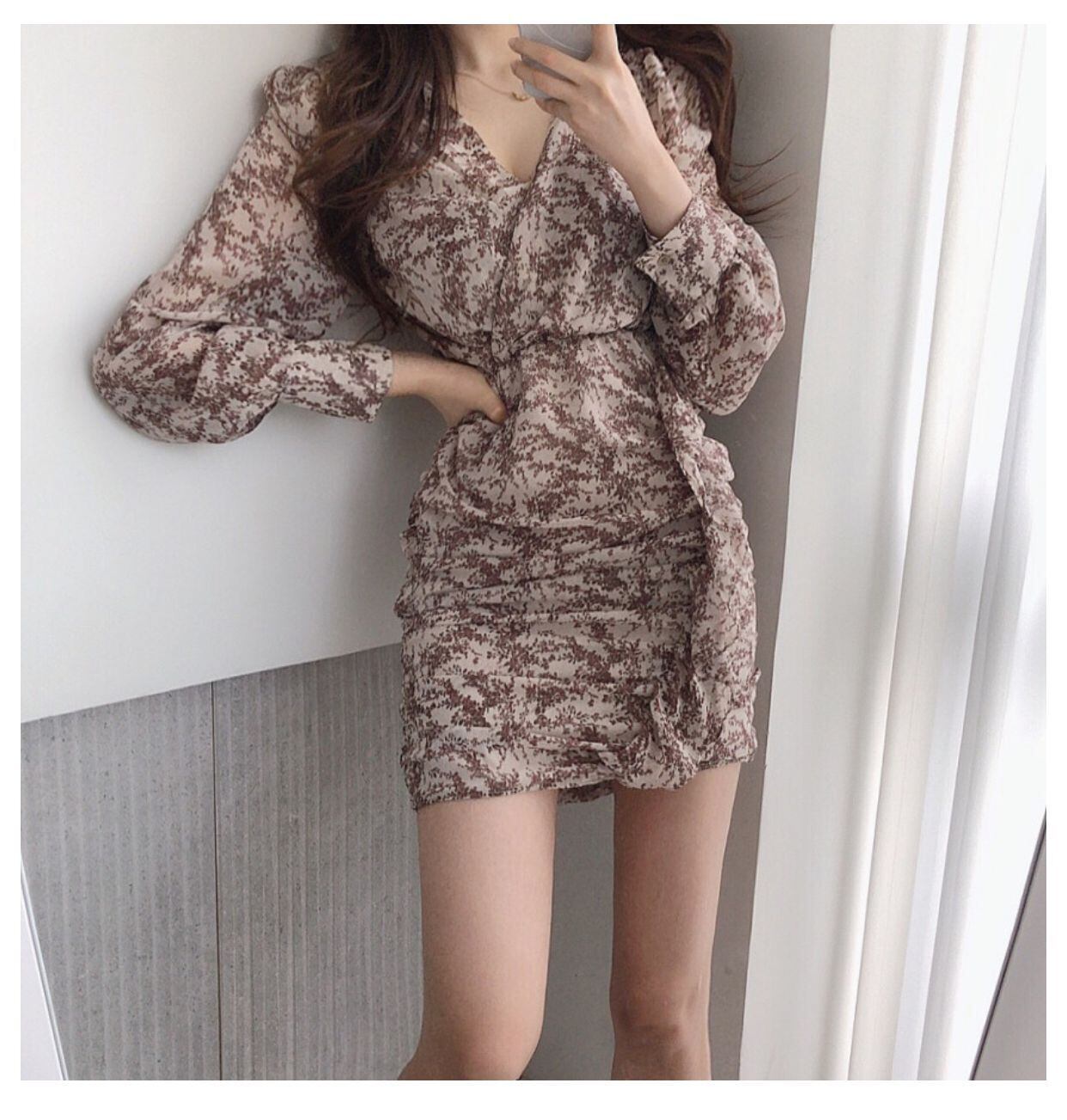 オータムVネックハイウェストフローラルドレス スカート 秋物 花柄 ステッチ 韓国婦人61189894885