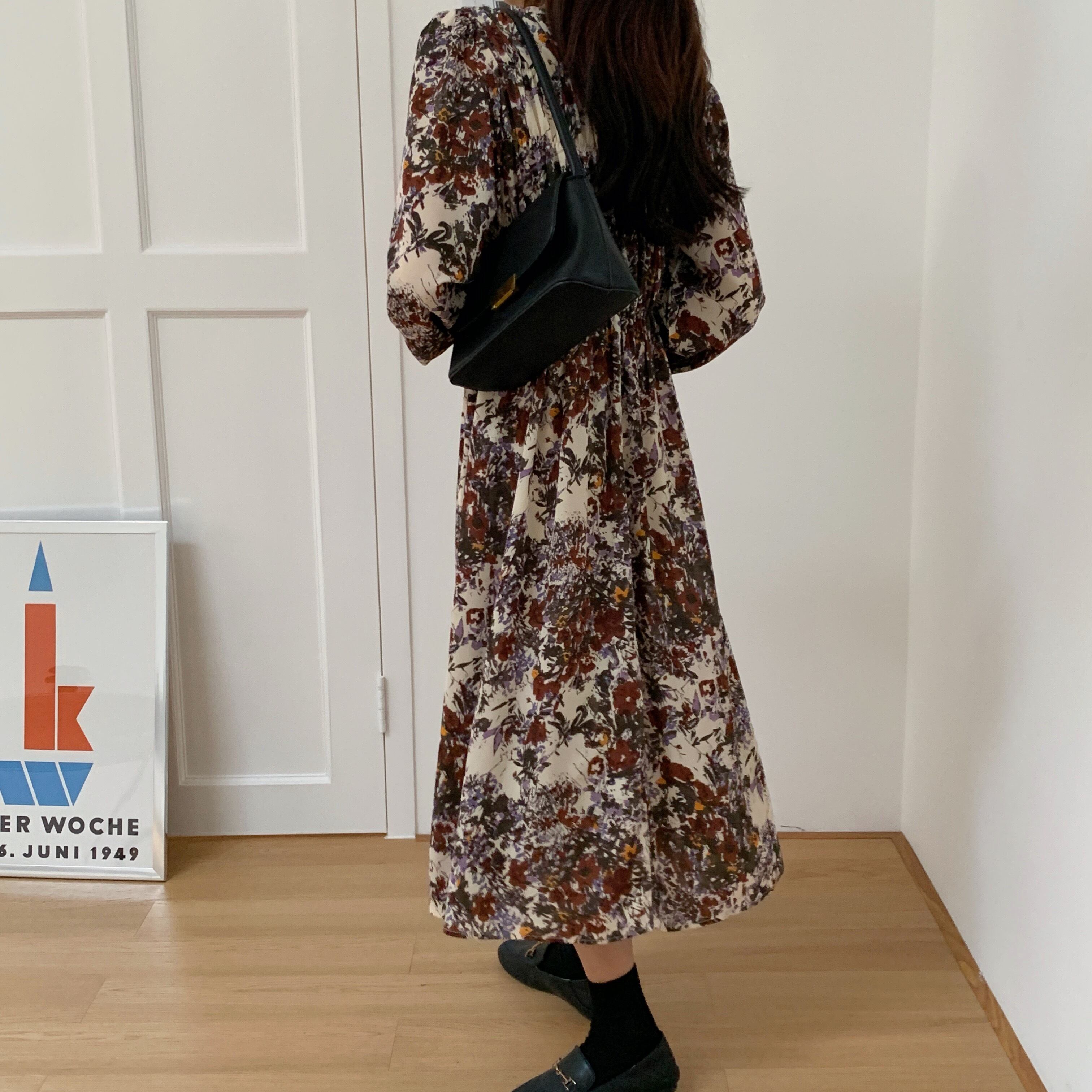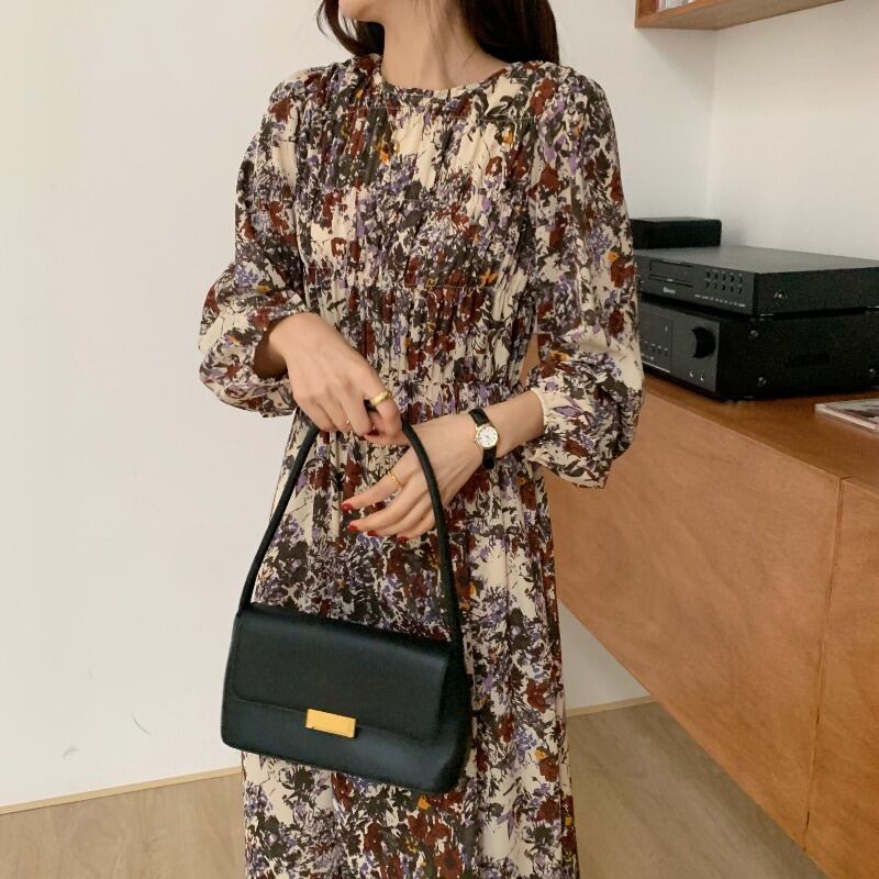 スプリングオータムスタンダードウェストシフォンフローラルドレス ロング レトロ 春物 秋物 花柄 韓国婦人11176046837