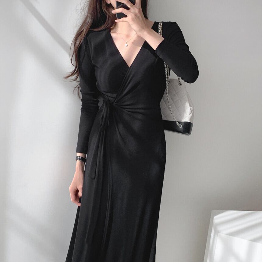 スタイルブラックスカート オータムウィンターロングウェスト薄手ドレス 秋物 冬物 韓国婦人58871012170