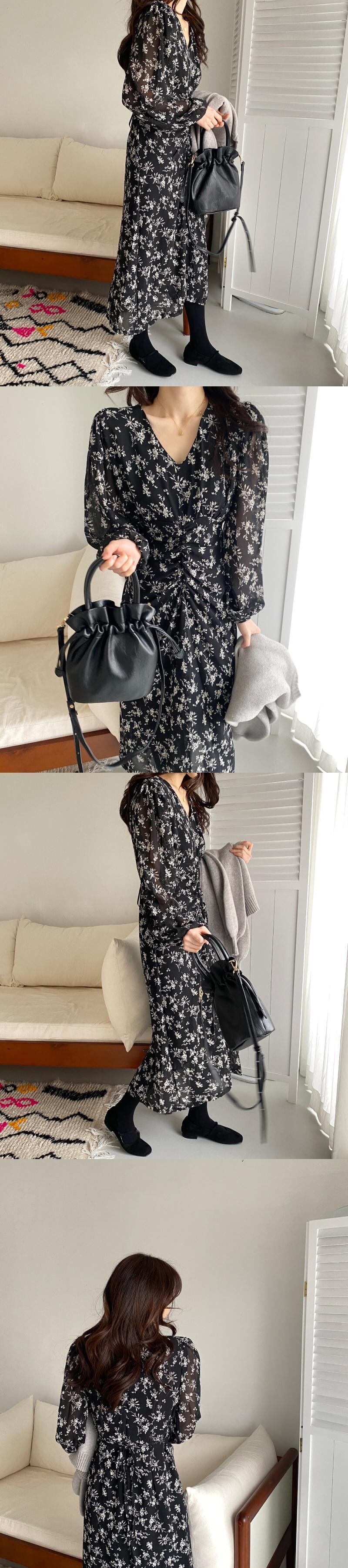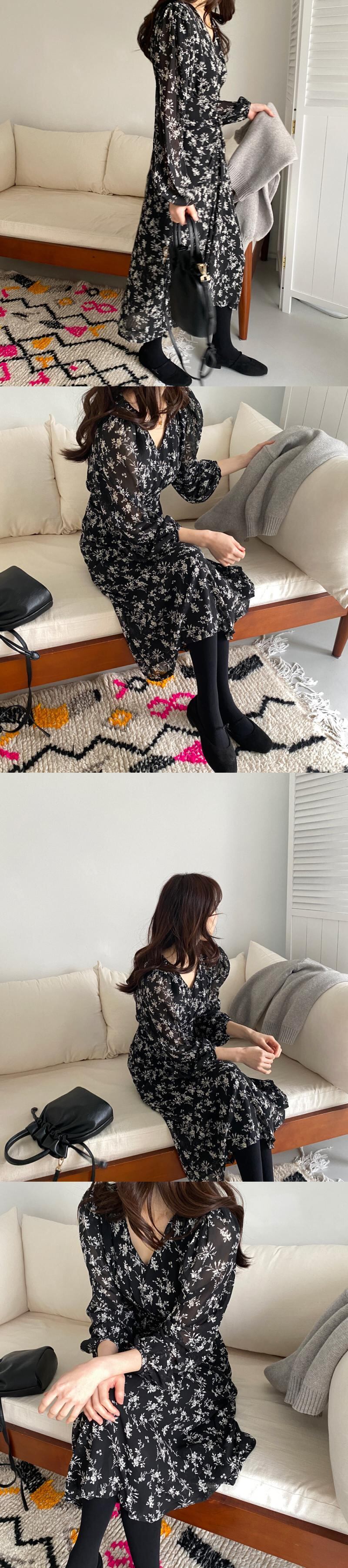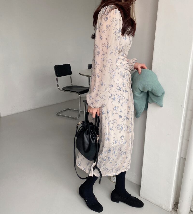 スプリングVネックプリーツウェスト長袖スリーブシフォンフローラルドレス スカート ロング 春物 花柄 韓国婦人55367231306