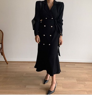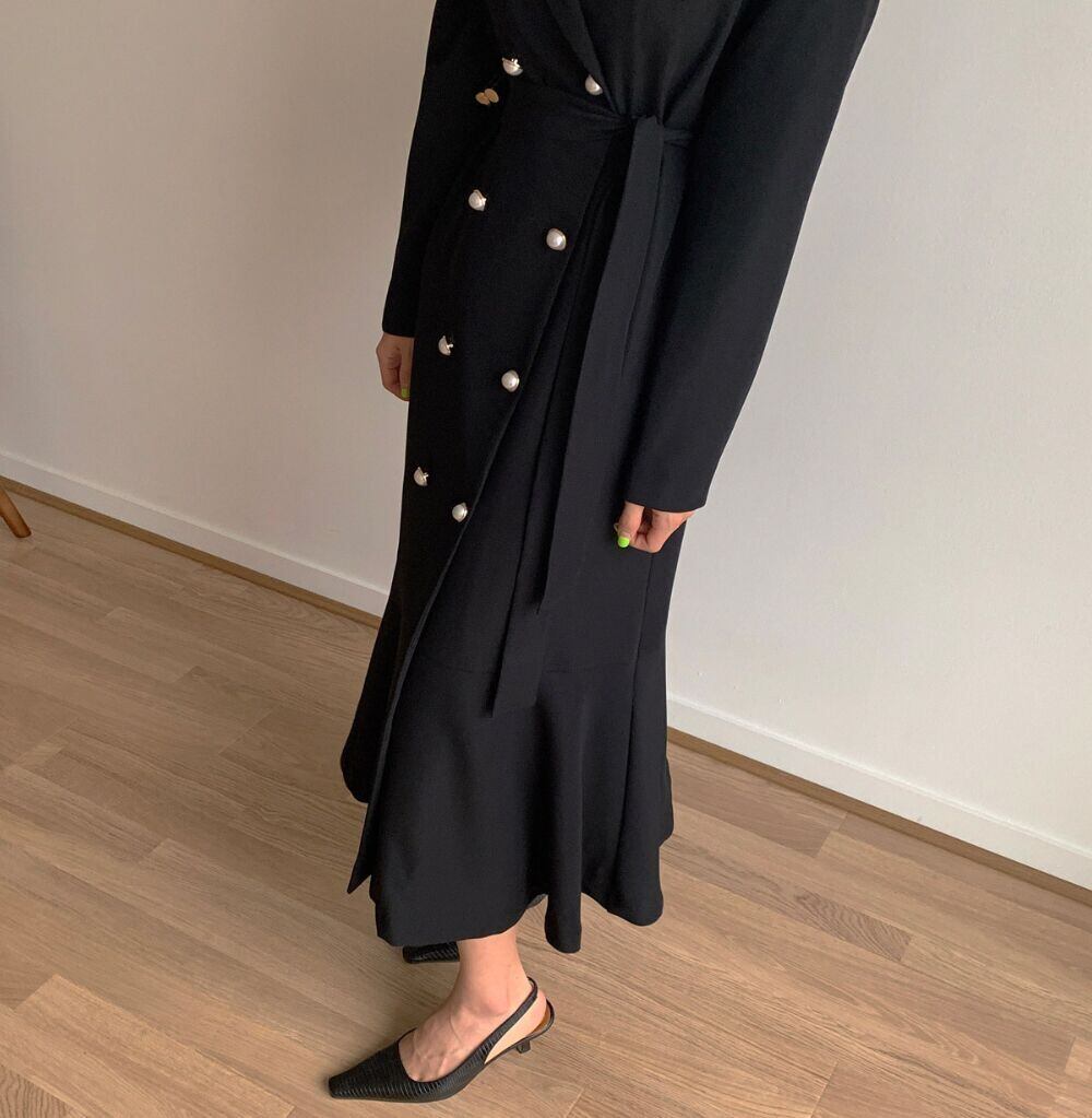 オータムウィンターカラーダブルブレストバンドウェストドレス ロングスカート 秋物 冬物 韓国婦人62411354017