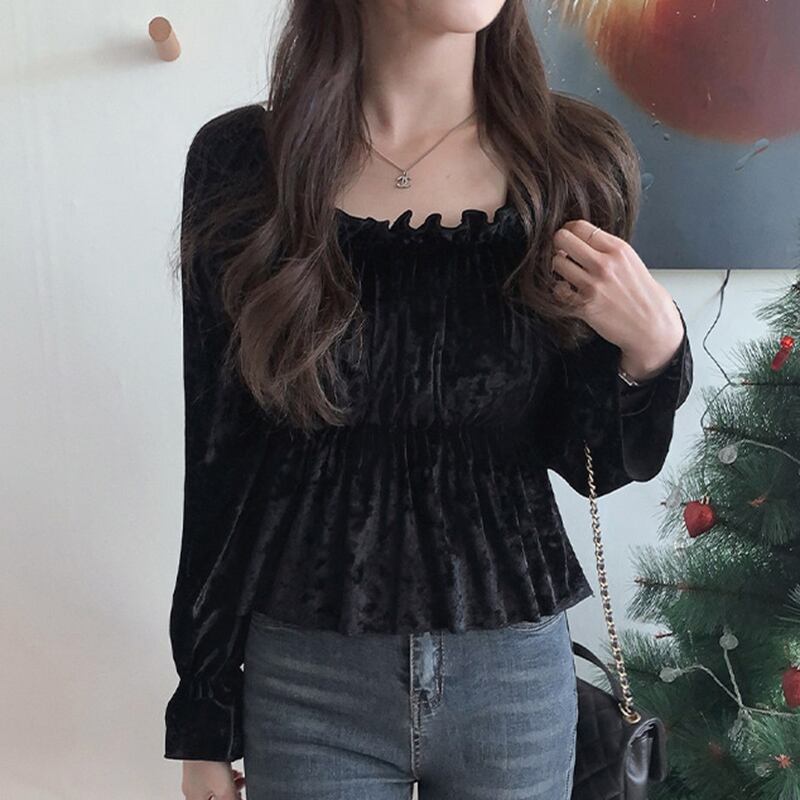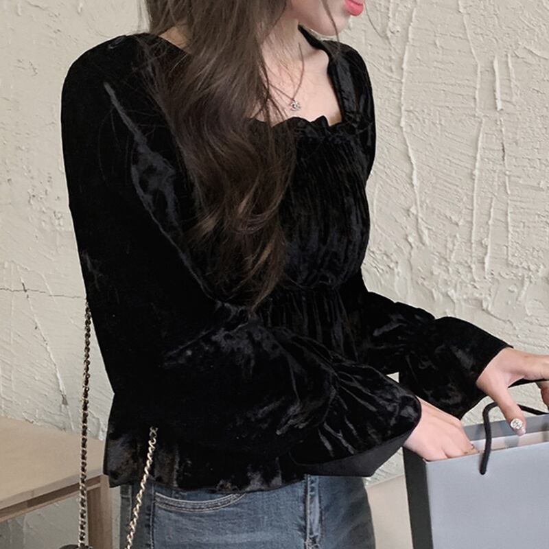 カラースタンダードスリーブトップス スプリングショートベルベットシャツ ロング レトロ 春物 スクウェア 韓国婦人9747765752
