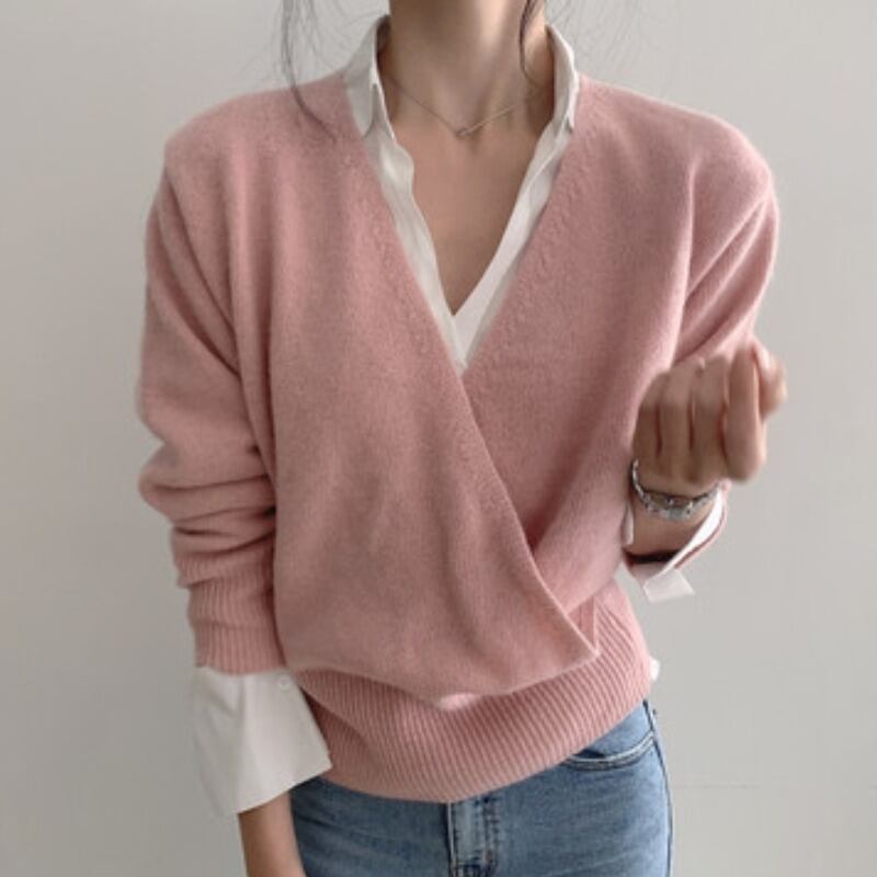Vネックセーター オータムプルオーバー ルーズ薄手トップス ピンク 秋物 韓国婦人72882303634