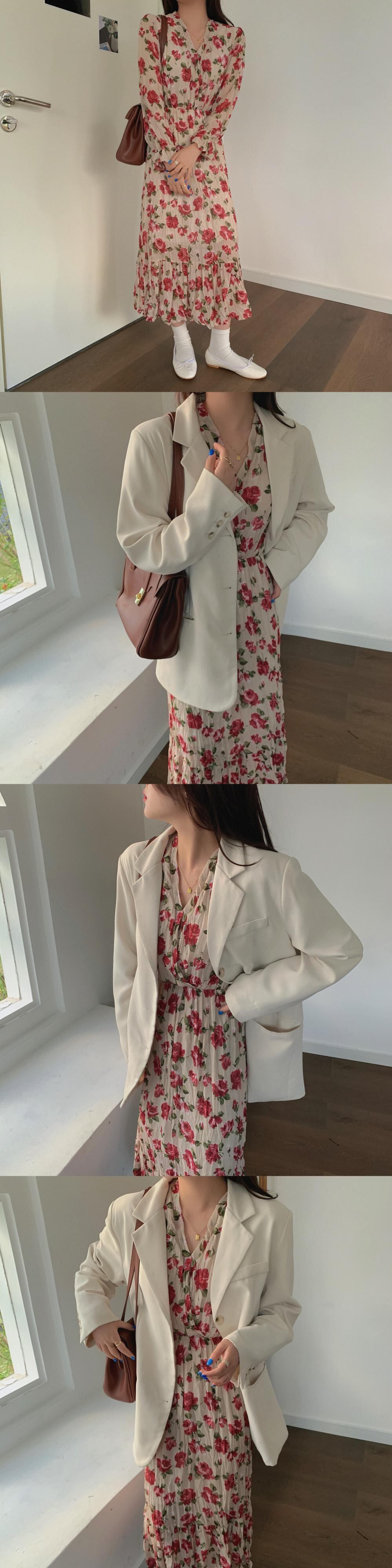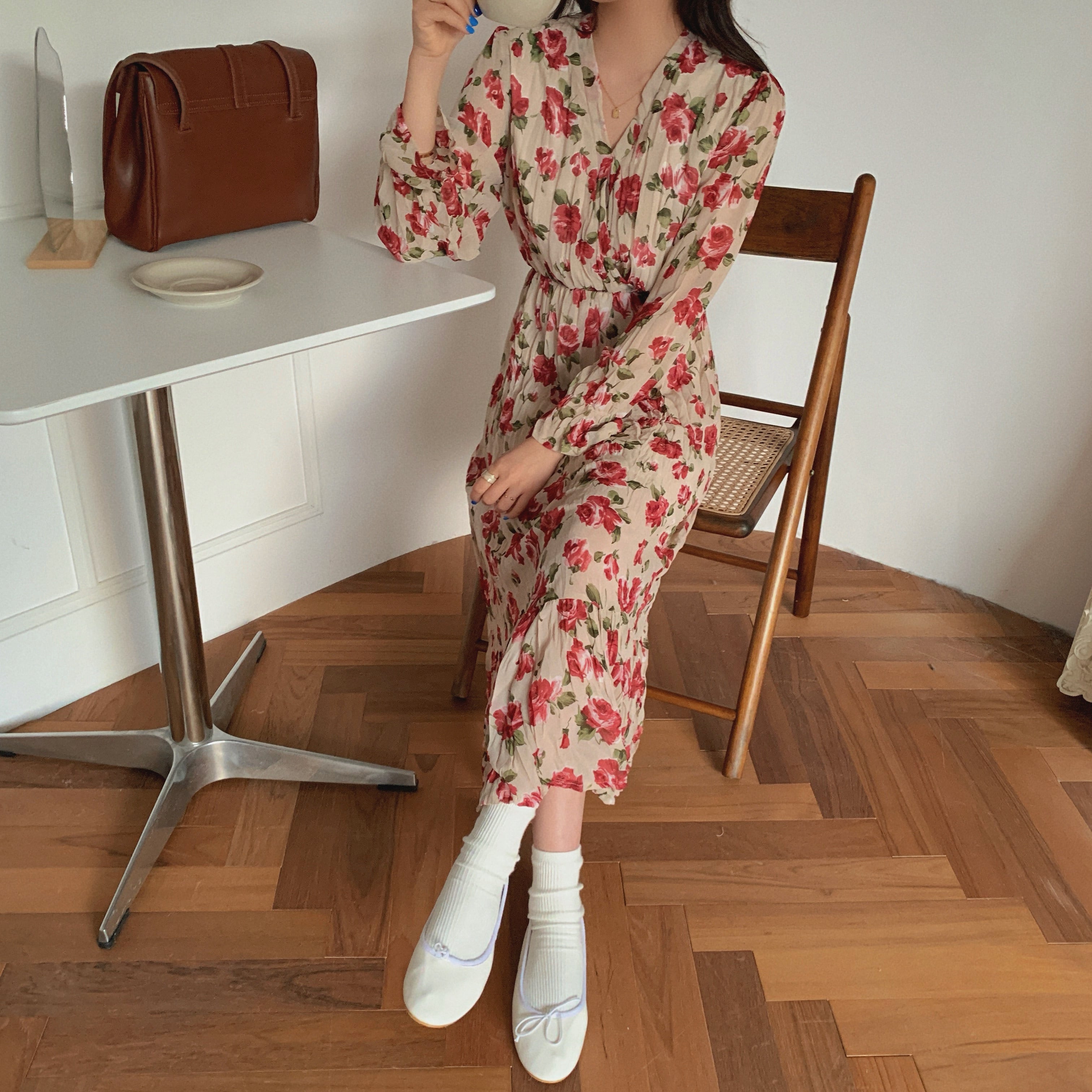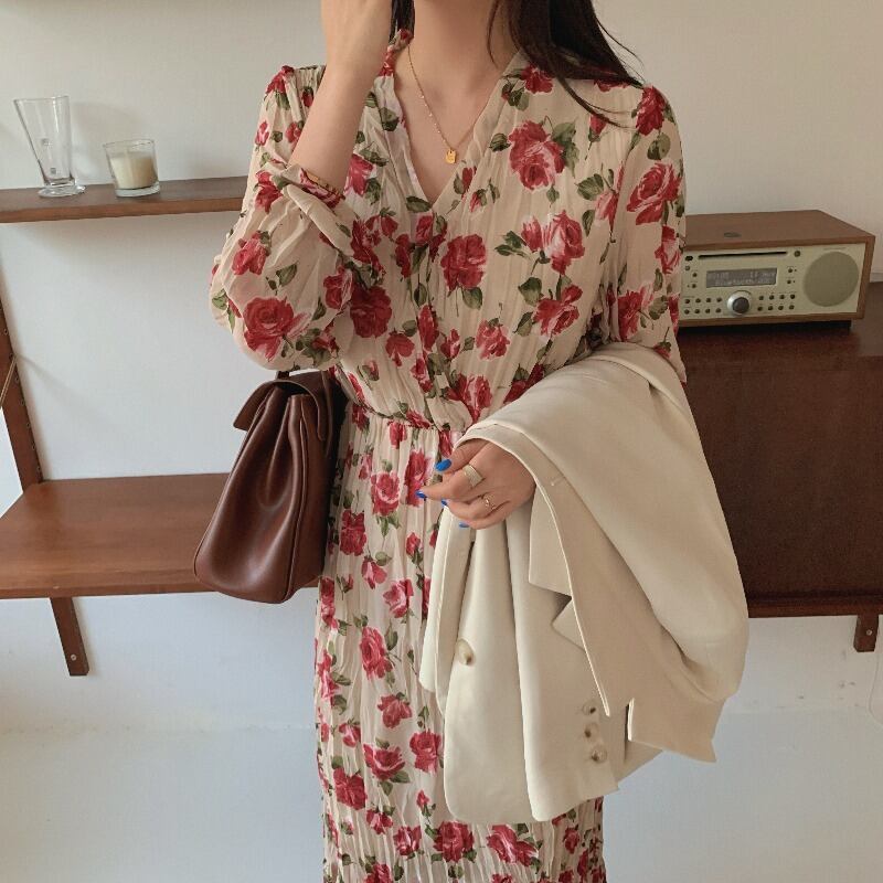 スプリングオータムフローラルシフォンVネックドレス ウェストロングスカート 春物 秋物 花柄 韓国婦人56432798024