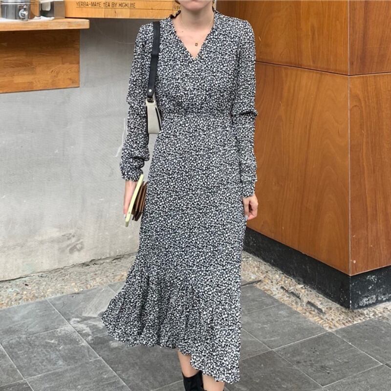 スプリングVネックシフォンフローラルドレス スリムスカート ロング 春物 花柄 韓国婦人27457148176