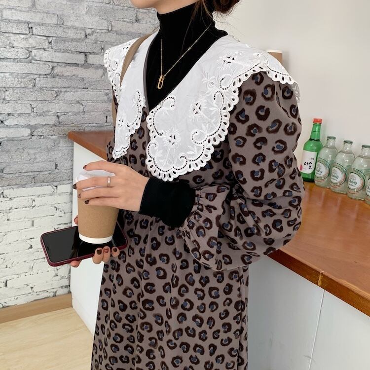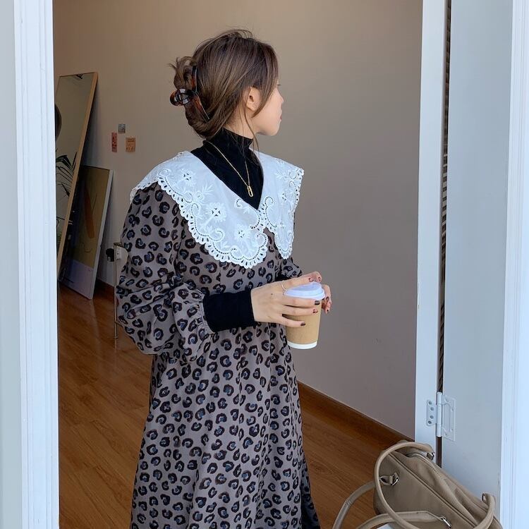 スプリングカラーレオパードプリント柄ドレス スタイルスカート レッド 刺繍 春物 ステッチ 韓国婦人73792224906