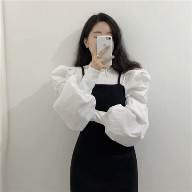 スタンダードスタイルラウンドネックスリーブセーター 薄手シャツ ランタンスリーブ レトロ レース Oネック ステッチ 韓国婦人10900503536