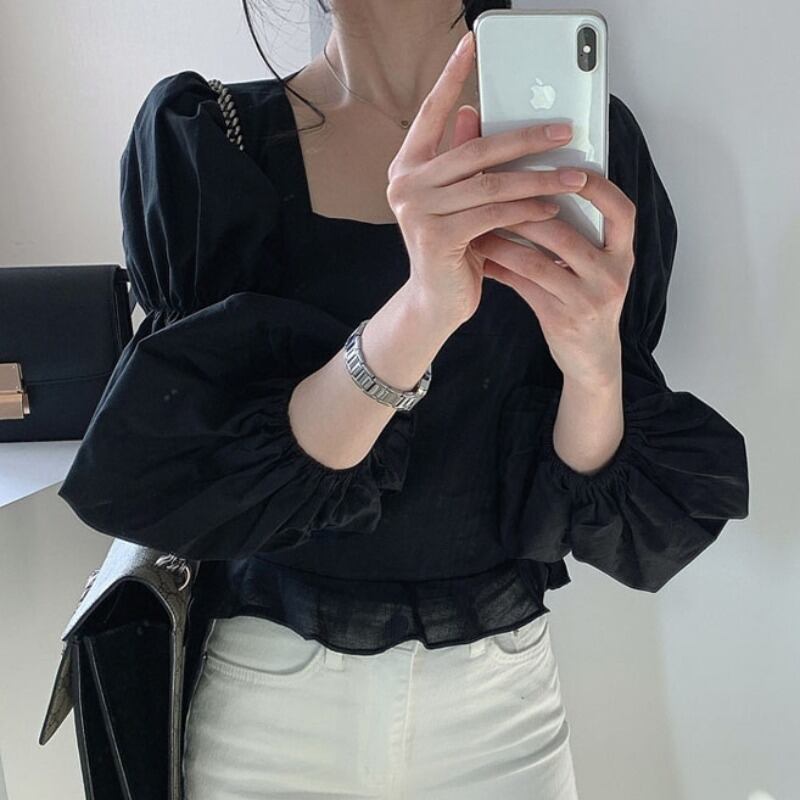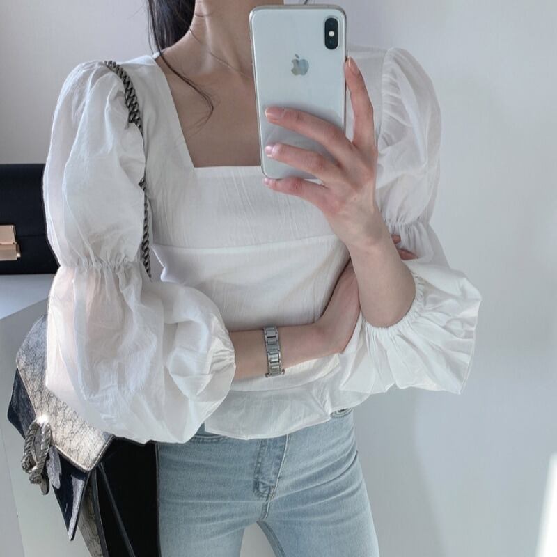 ホワイトカラーシャツ ショートトップス スプリングオータムロング薄手 長袖 春物 秋物 スクウェア 韓国婦人38392465414