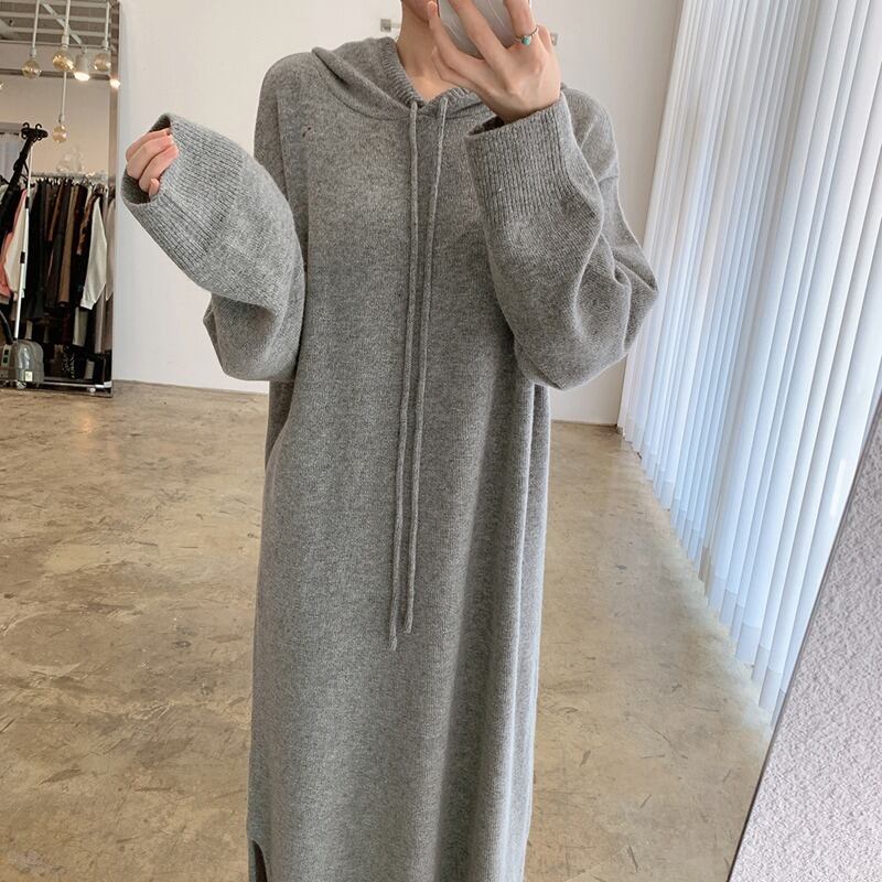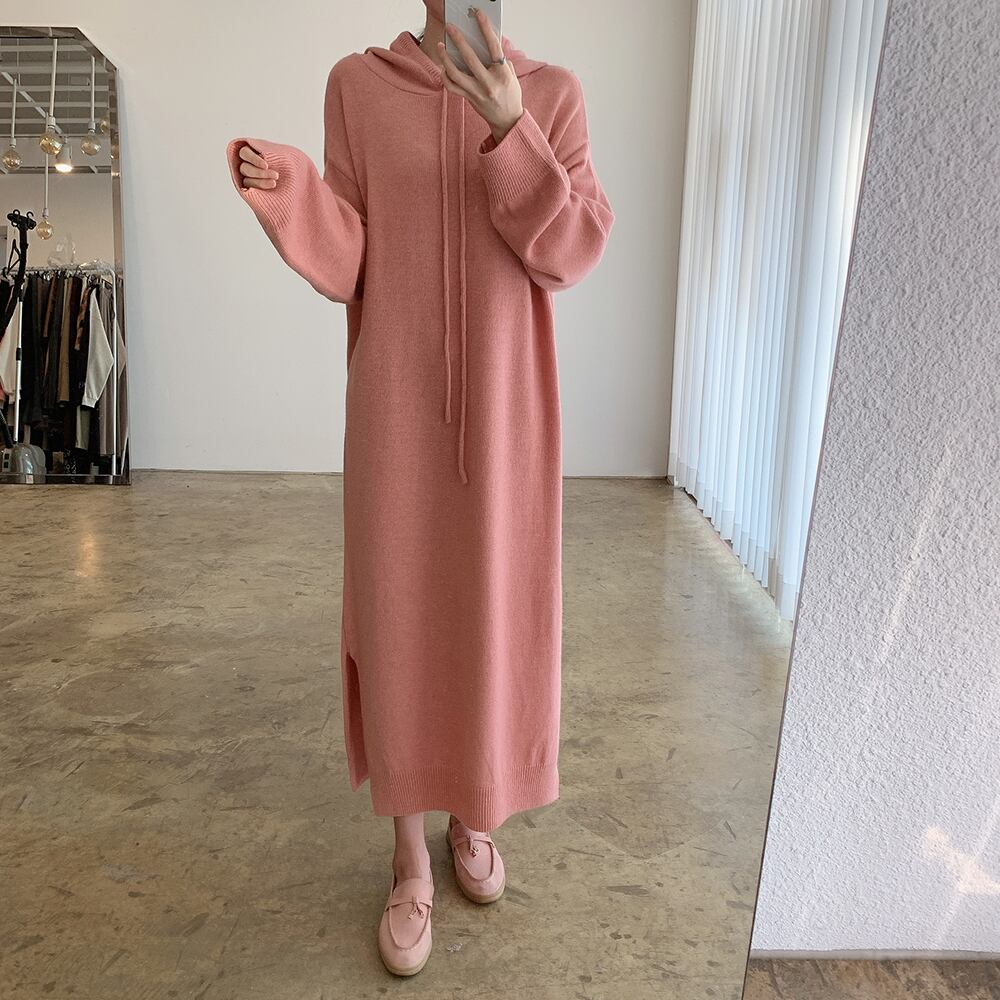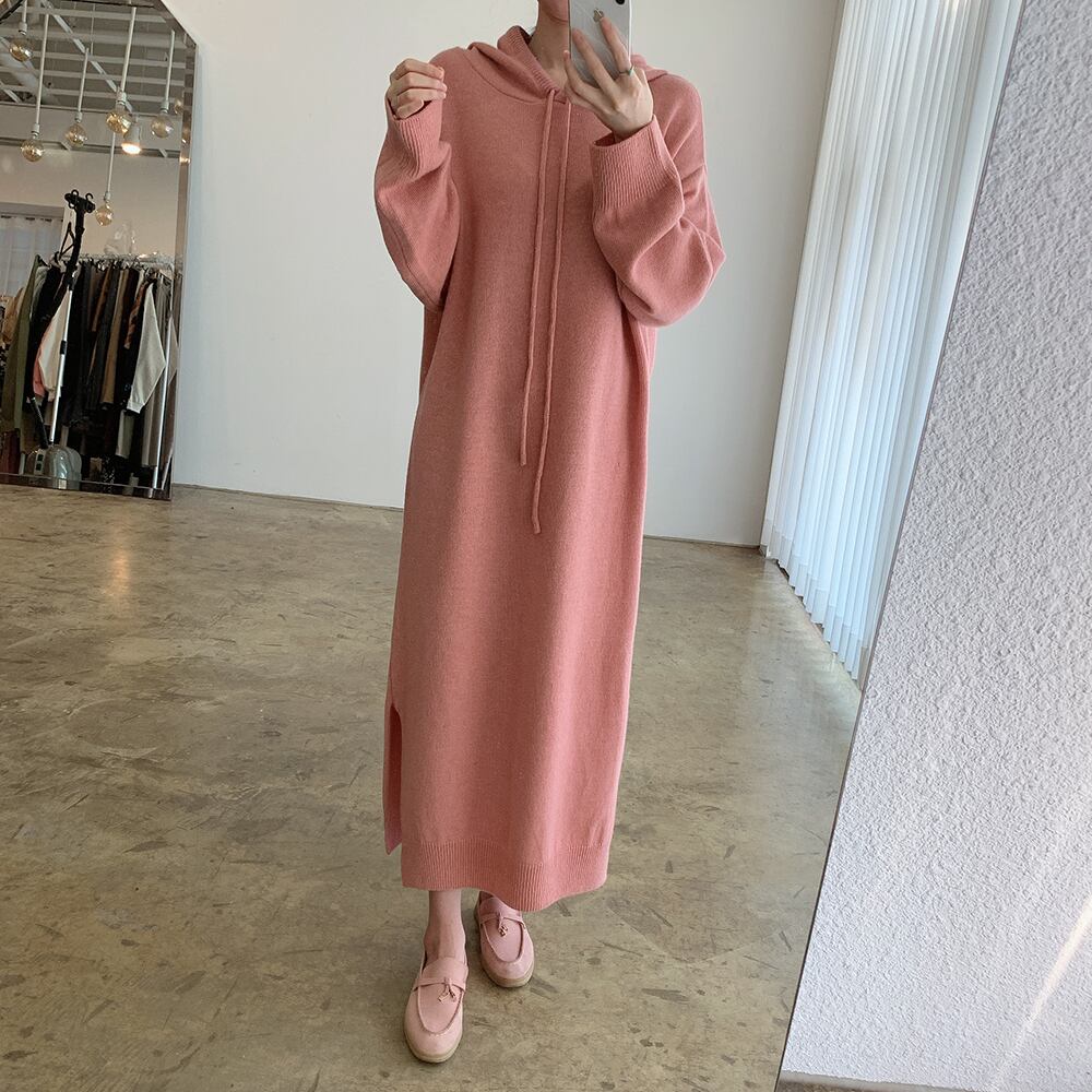 ルーズロングセーター ドレス カジュアルフードニットレディース 韓国婦人16800640941