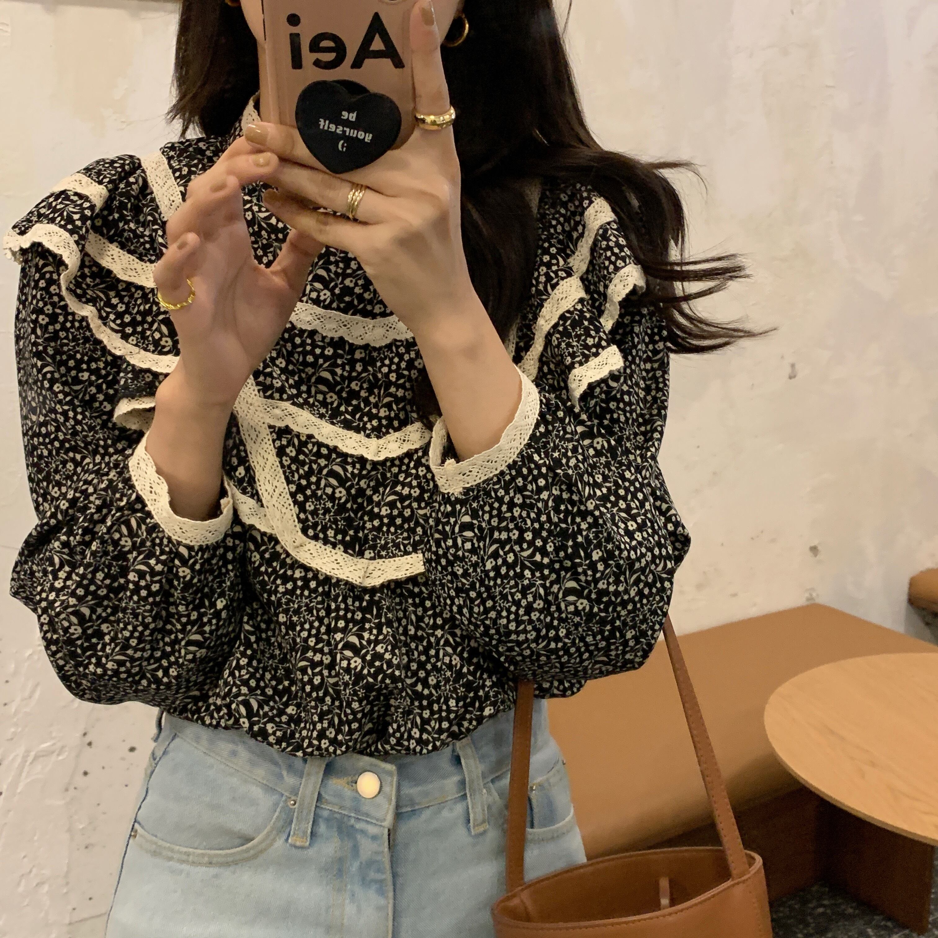 オータムスタンダードフローラルレースカラールーズシャツ トップス レディース ロング レトロ 秋物 花柄 ステッチ 韓国婦人71945201732