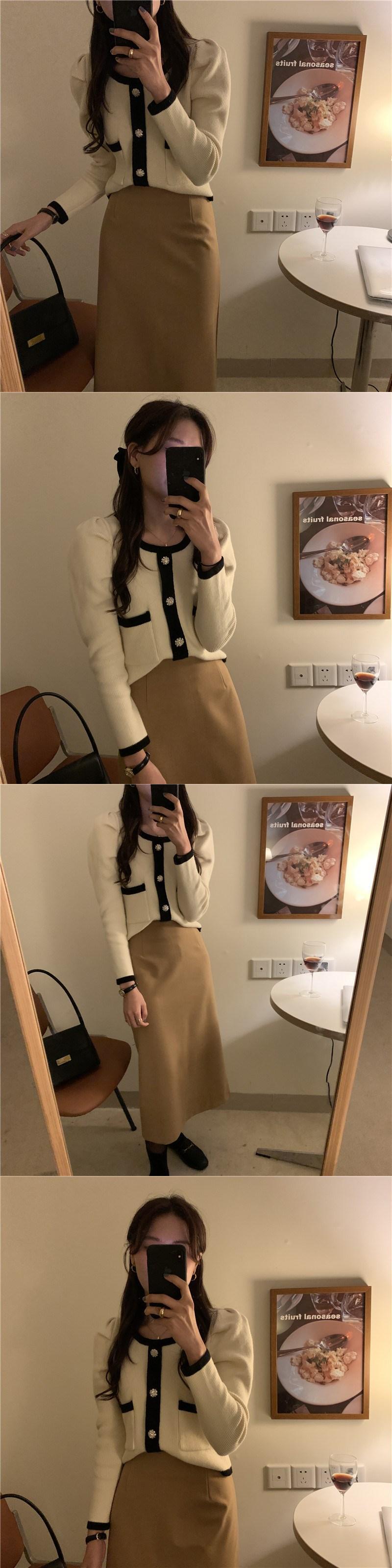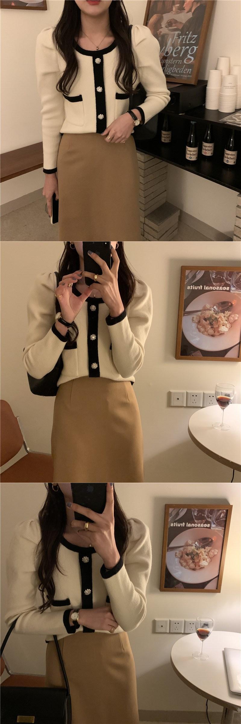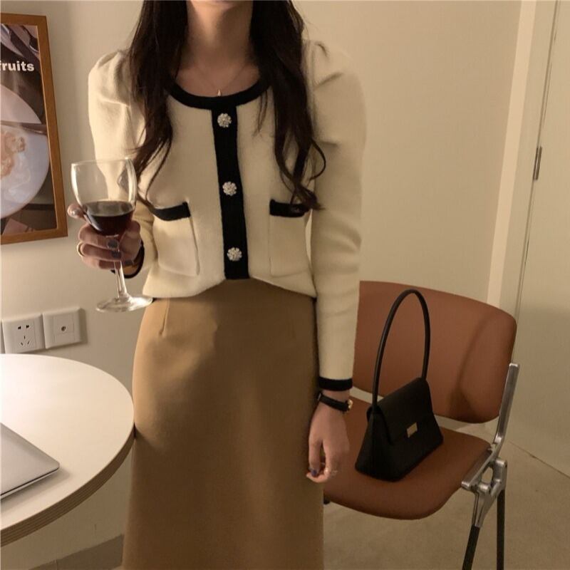 ラウンドネックスリーブショートセーター ハイウェストウェストスリムスカート エレガント Oネック 韓国婦人54573506539