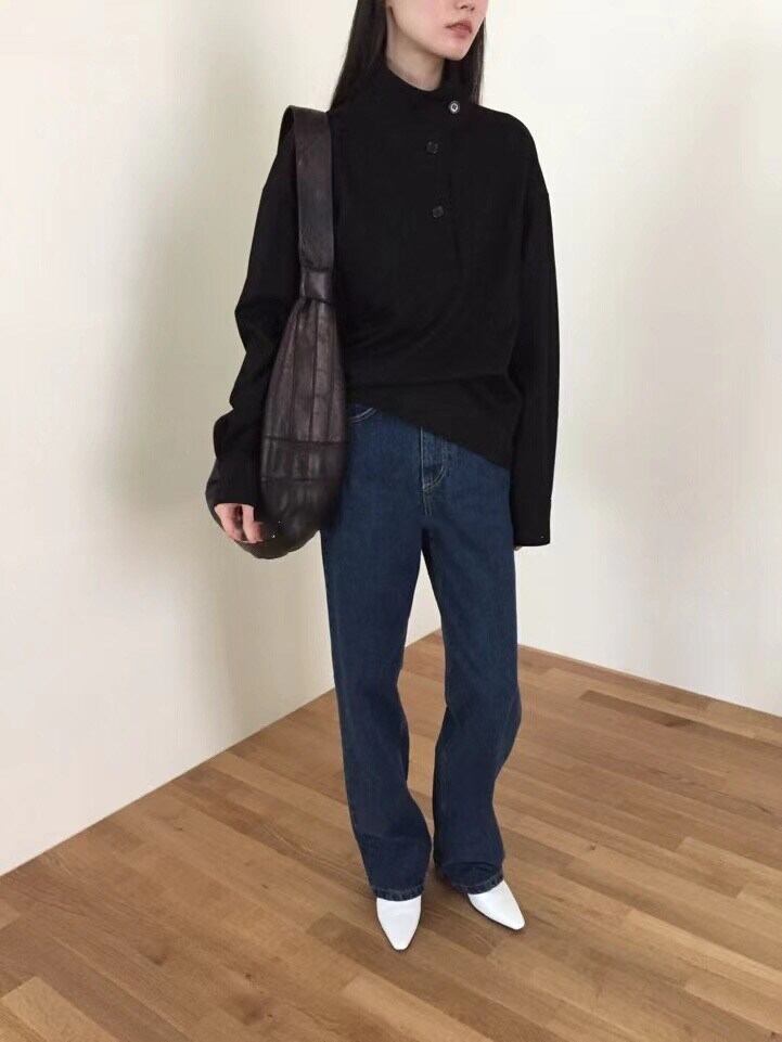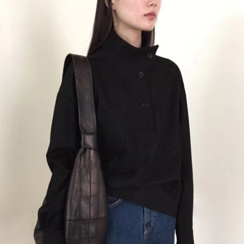 スプリングスタンドカラーカラーバックルルーズソリッド カジュアルシャツ トップス レディース ロング 春物 ソリッドカラー 韓国婦人27185327313