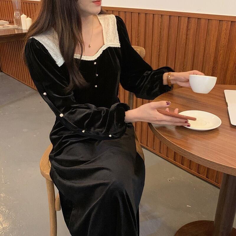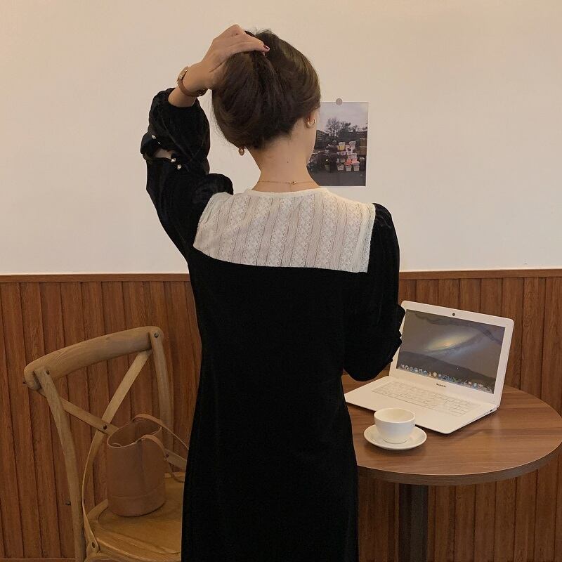 オータムウィンターカラーレーススタイルゴールドベルベットドレス 秋物 冬物 スクウェア ステッチ 韓国婦人73386080237