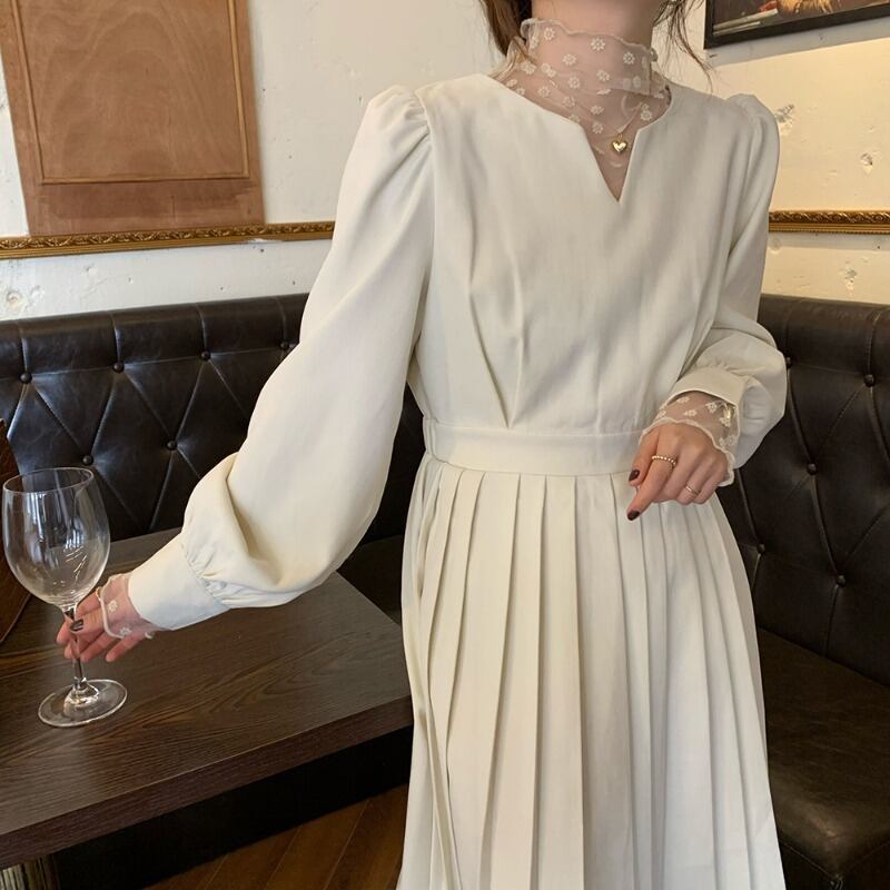 スタンダードソリッド カラーVネックプリーツハイウェストドレス Flowerデザイン シャツ レトロ エレガント ソリッドカラー フラワーデザイン 韓国婦人80331570296