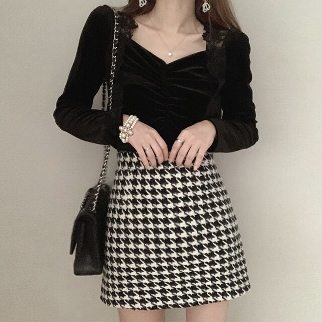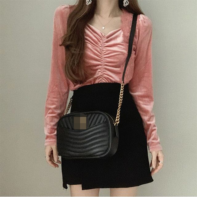 スタンダードレースカラーシャツ スリムベルベットTシャツ トップス ロング レトロ スクウェア ステッチ 韓国婦人58905100371