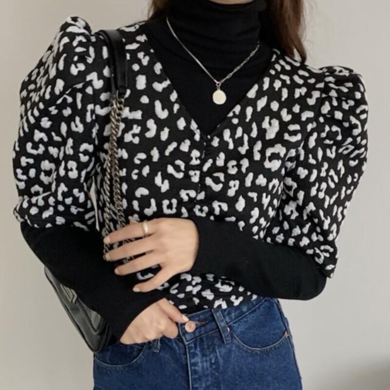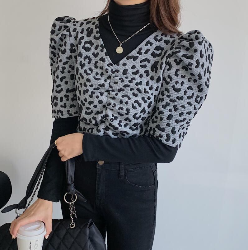 ウィンターレオパードプリント柄Tシャツ レディース レッド 冬物 Vネック 韓国婦人32854633723