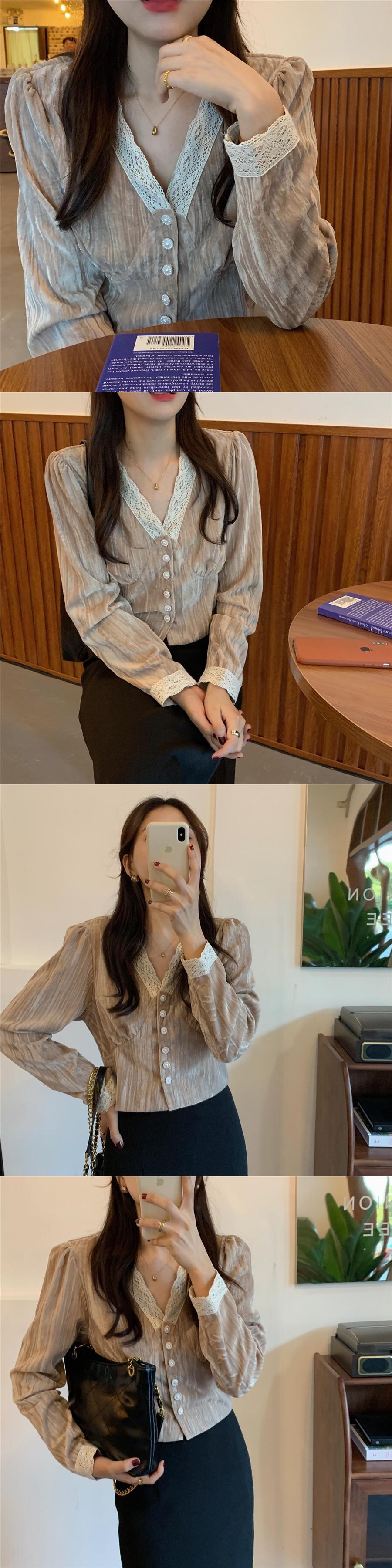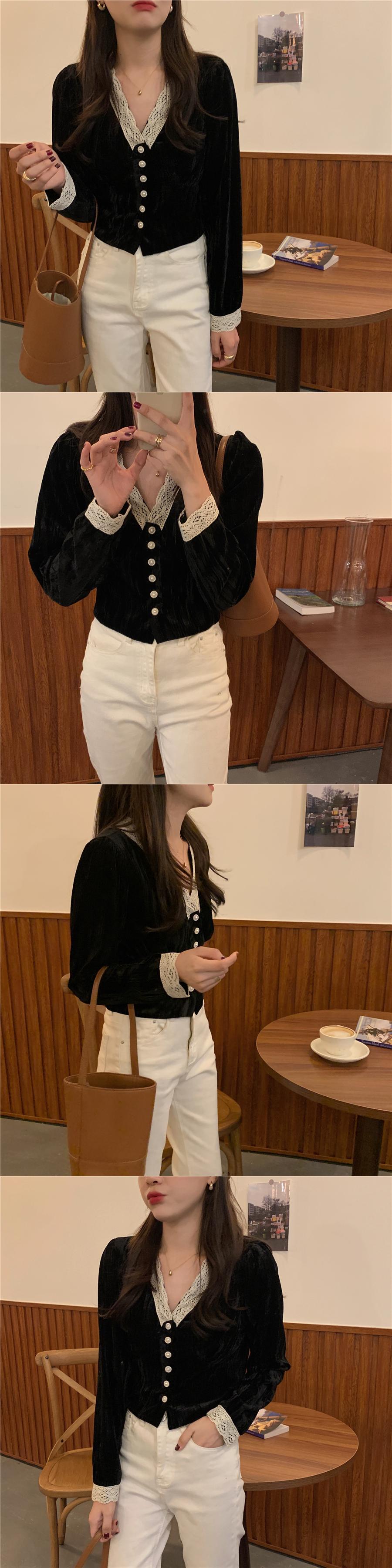 スプリングオータムVネックゴールドベルベットトップス スタイルシャツ レース 春物 秋物 韓国婦人81304149629