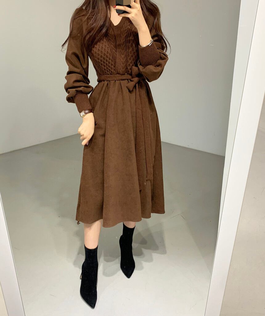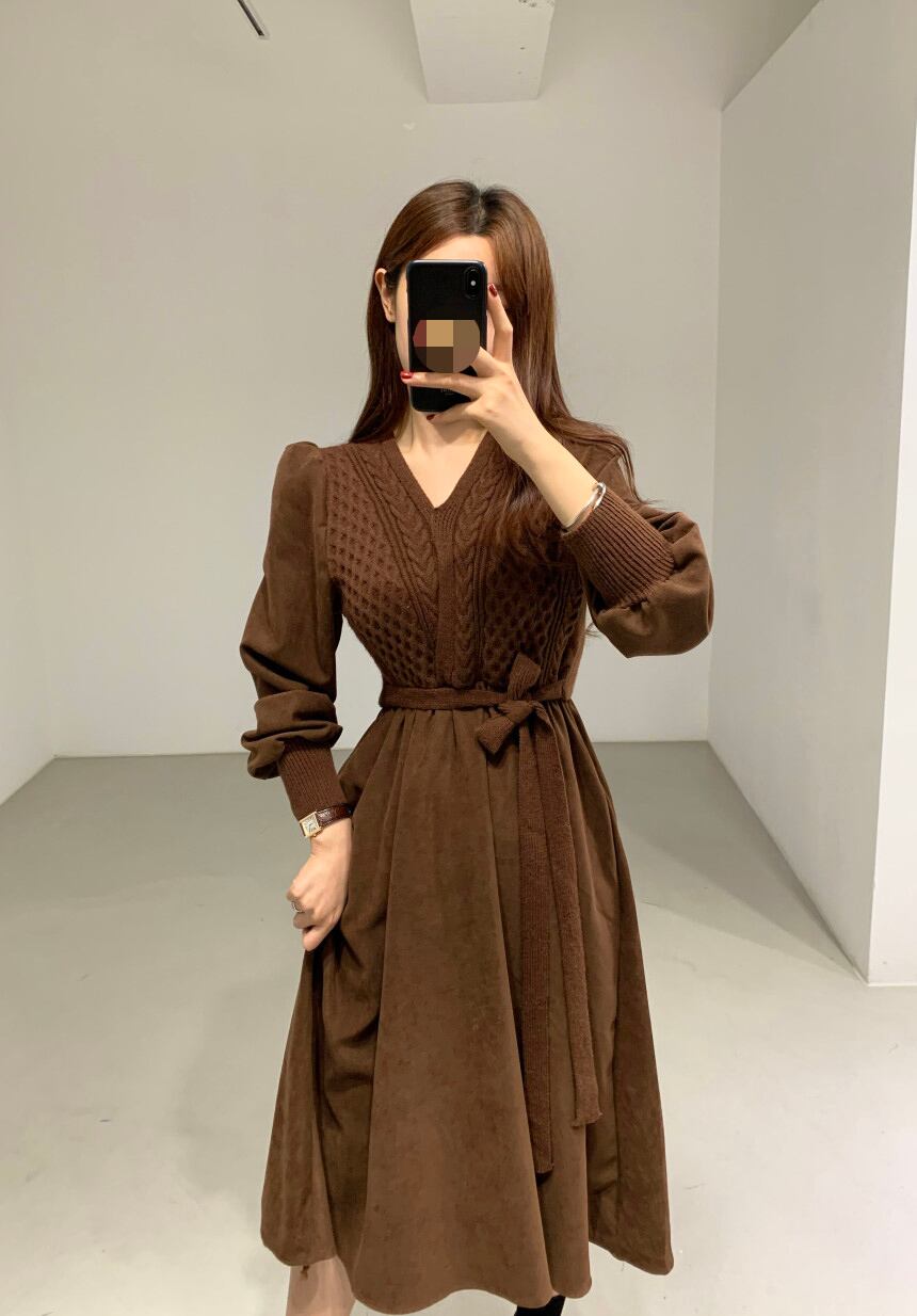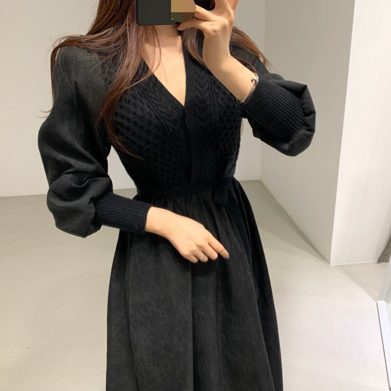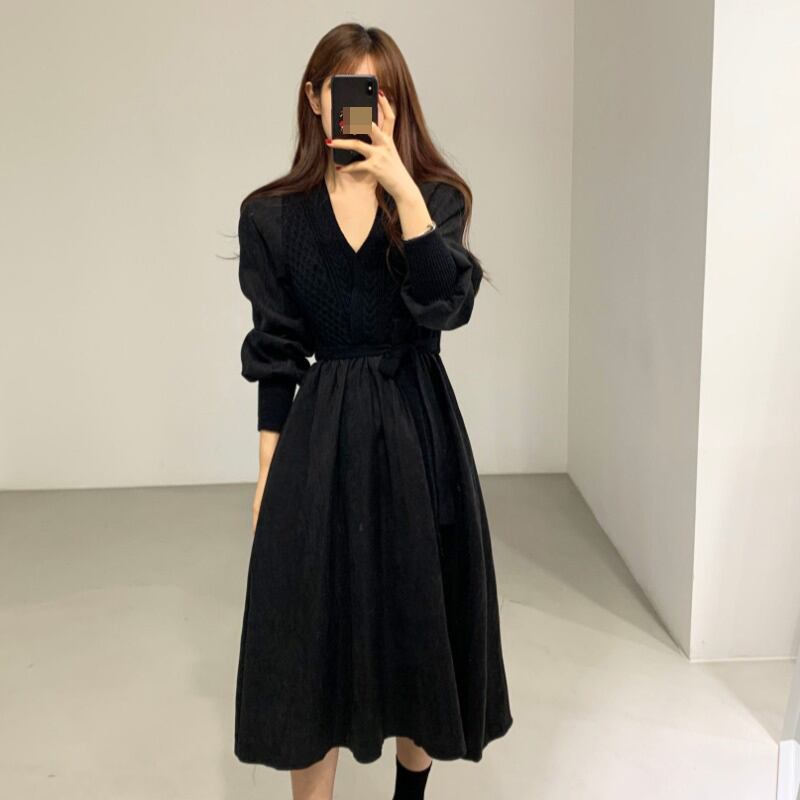 スタイルブラックドレス オータムウィンターニットスリーブ 秋物 冬物 ステッチ 韓国婦人45628113443