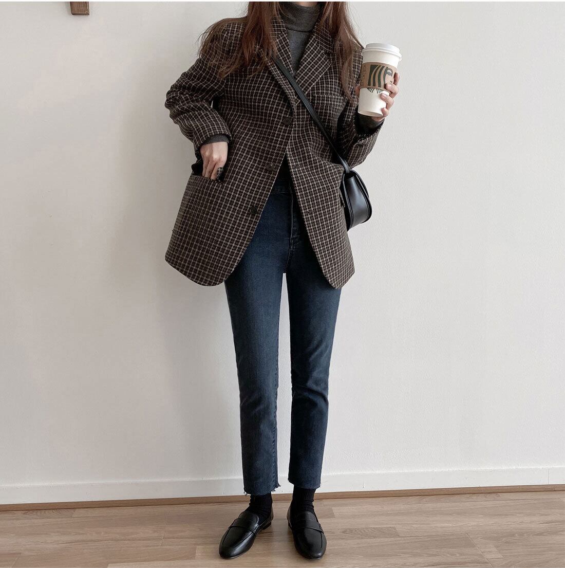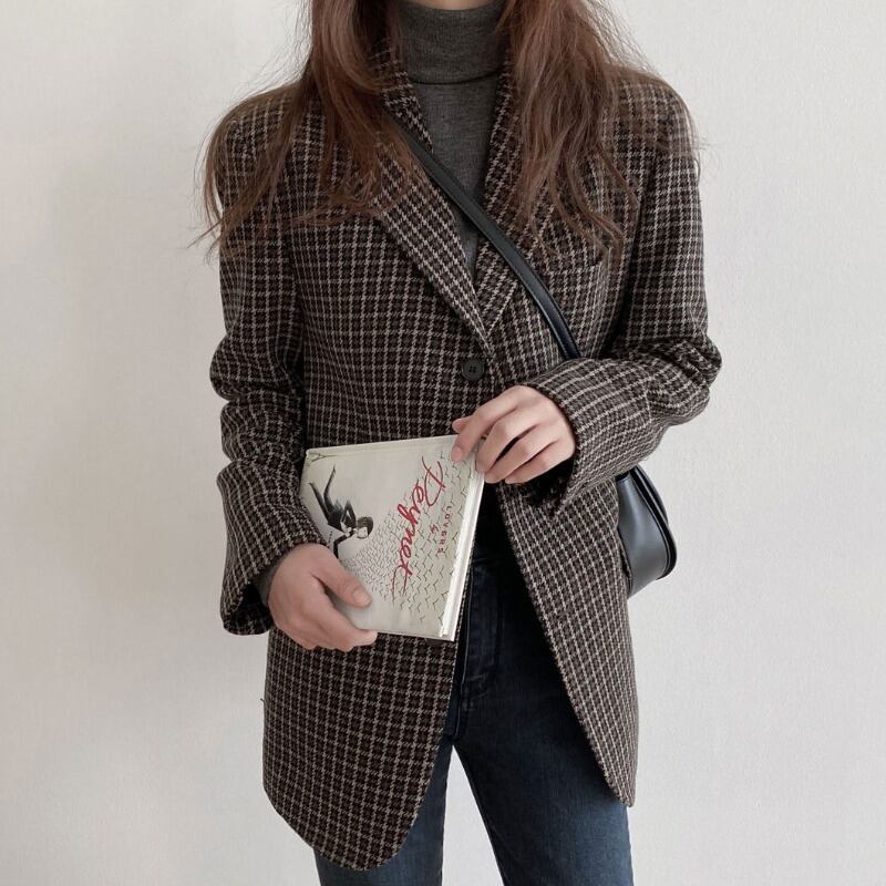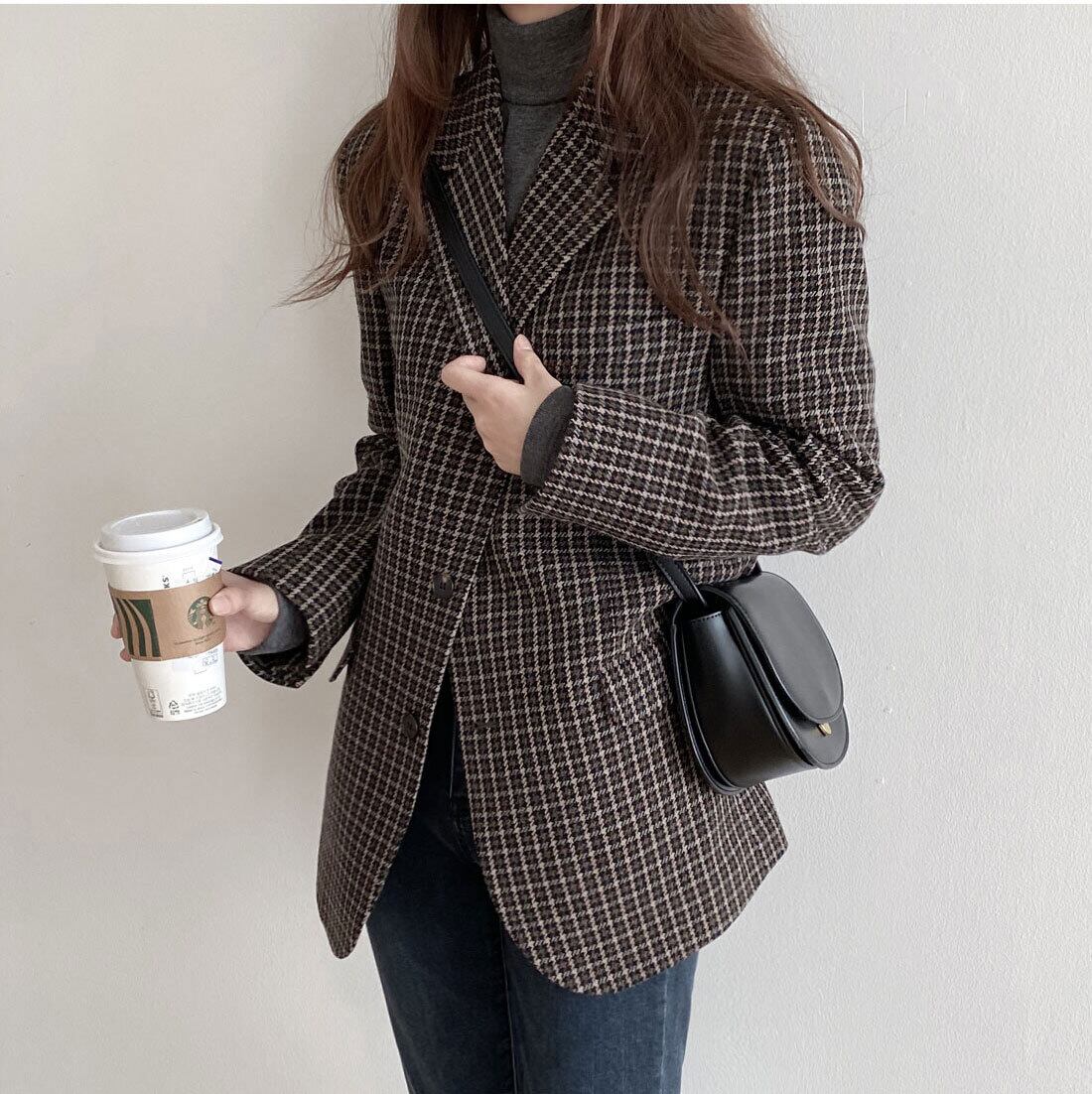 スプリングオータムスタンダードルーズ長袖スリーブポケット格子柄ジャケット レディース ロング レトロ 春物 秋物 韓国婦人85998888970