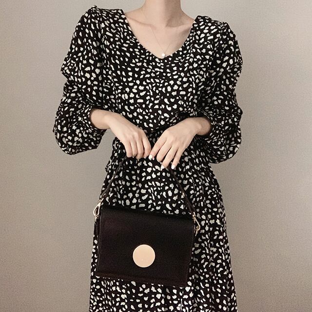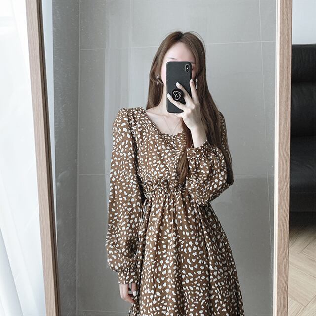 オータムスタンダードレオパードプリント柄薄手Vネックウェストロングドレス スカート レトロ 秋物 韓国婦人77995881747