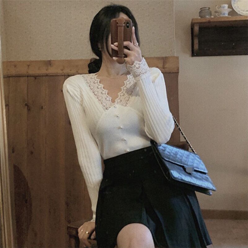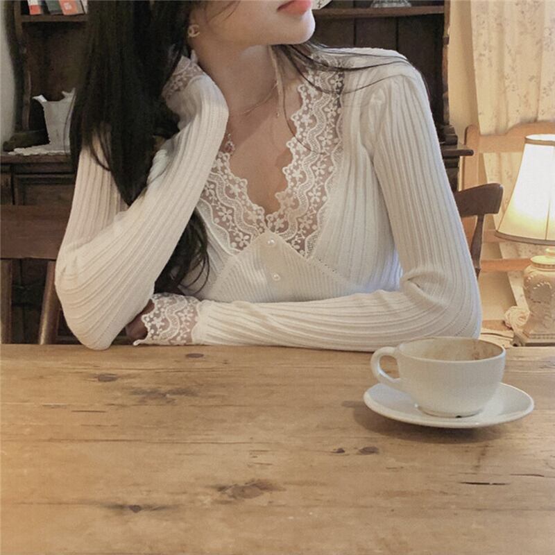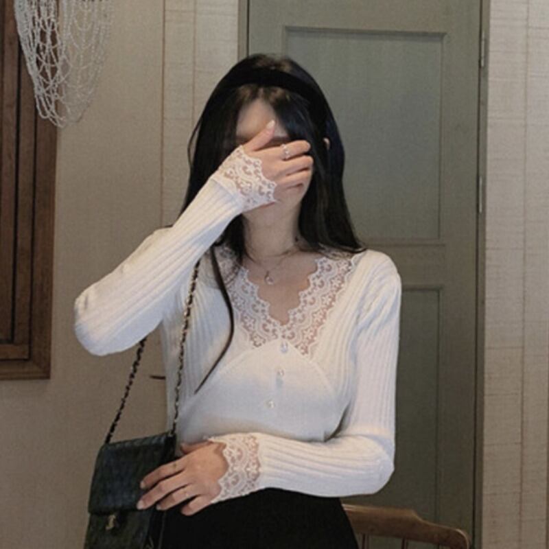 スプリングVネックスリムフィットレースシャツ トップス レディース 春物 韓国婦人16978529093