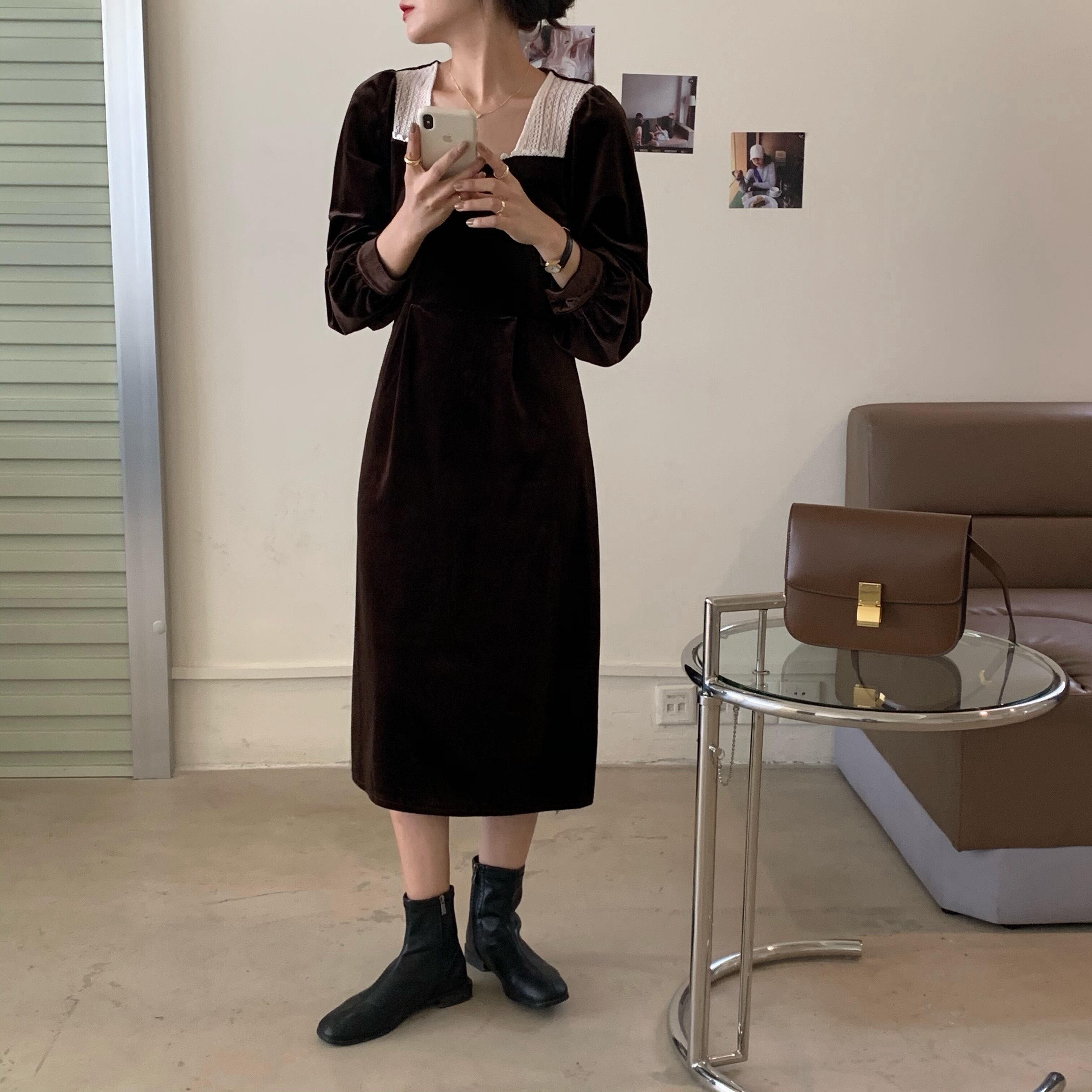オータムスタンダードスタイルベルベットブラックドレス レース ロング レトロ 秋物 韓国婦人21496748910