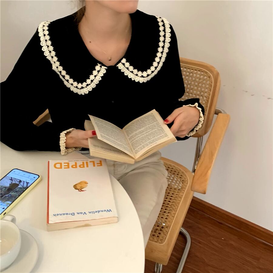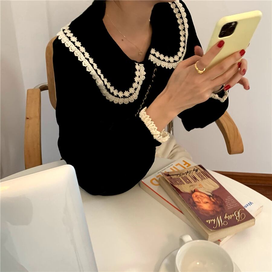 シャツ スタイルスタンダードカラーレースブラックベルベットトップス レトロ 韓国婦人52691192756