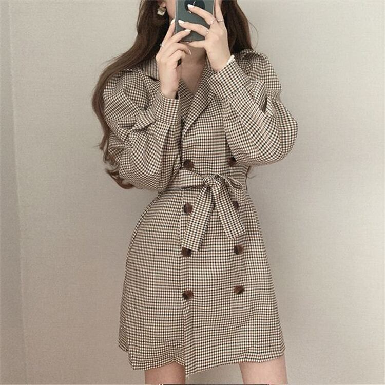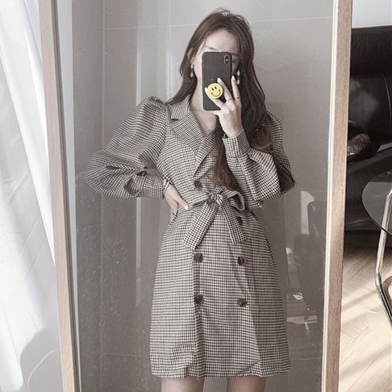 スプリングオータムカーディガン格子柄ウェスト薄手カラーショートドレス 春物 秋物 韓国婦人67716975075