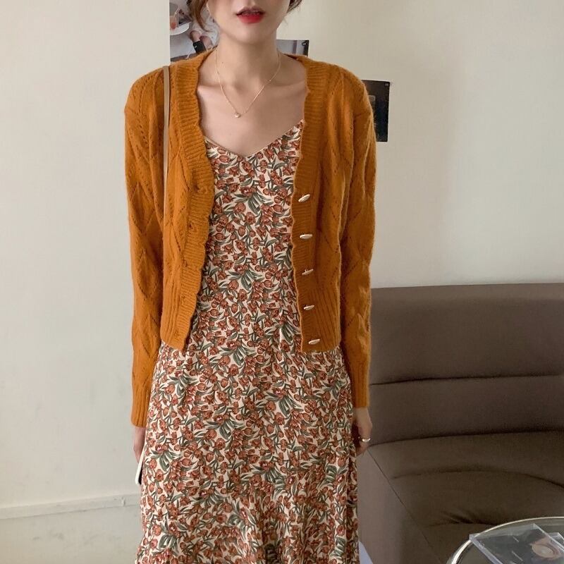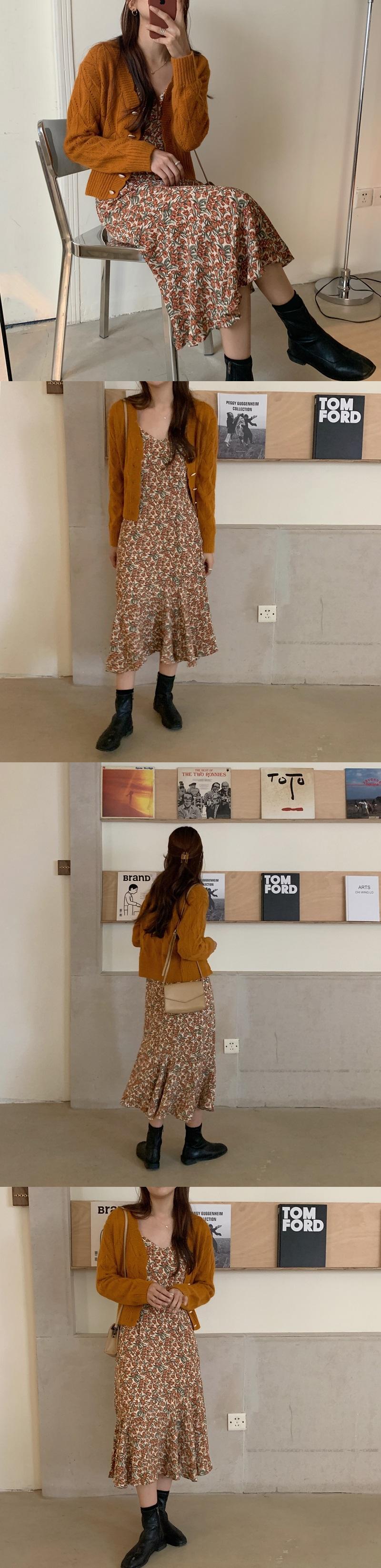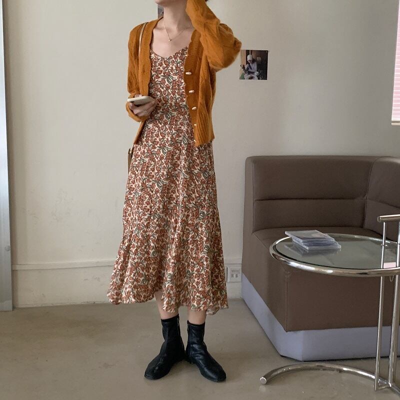 オータムVネックフローラルドレス パールバックルニットセーター 秋物 花柄 真珠 韓国婦人95929532240