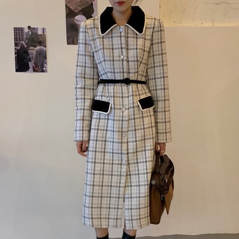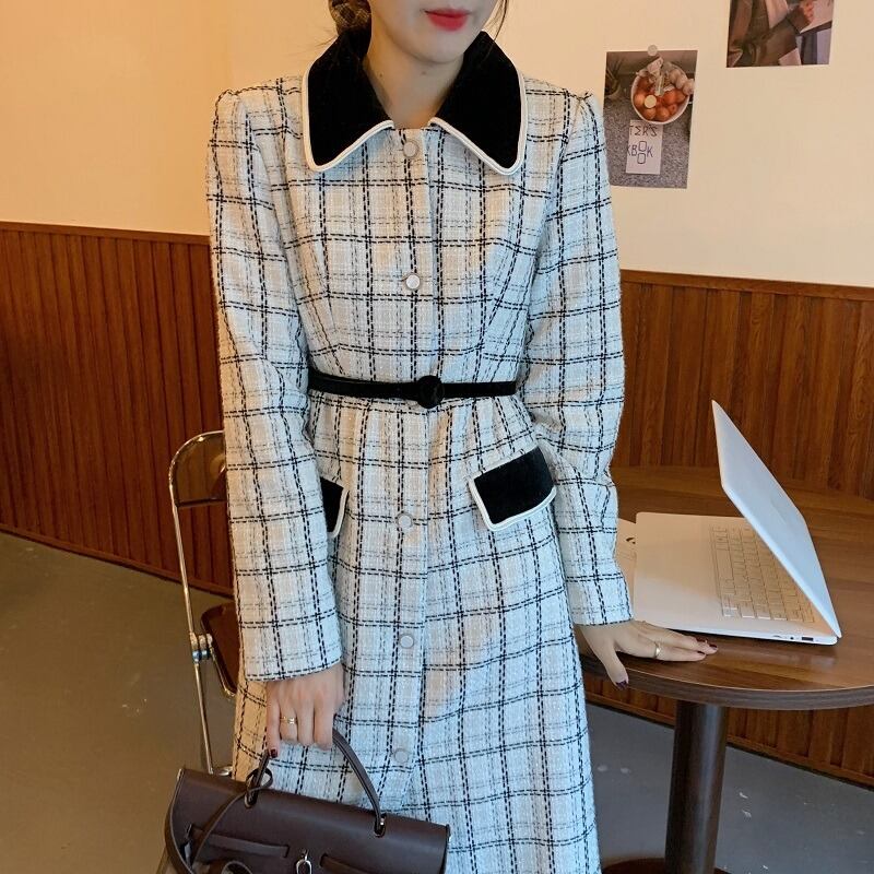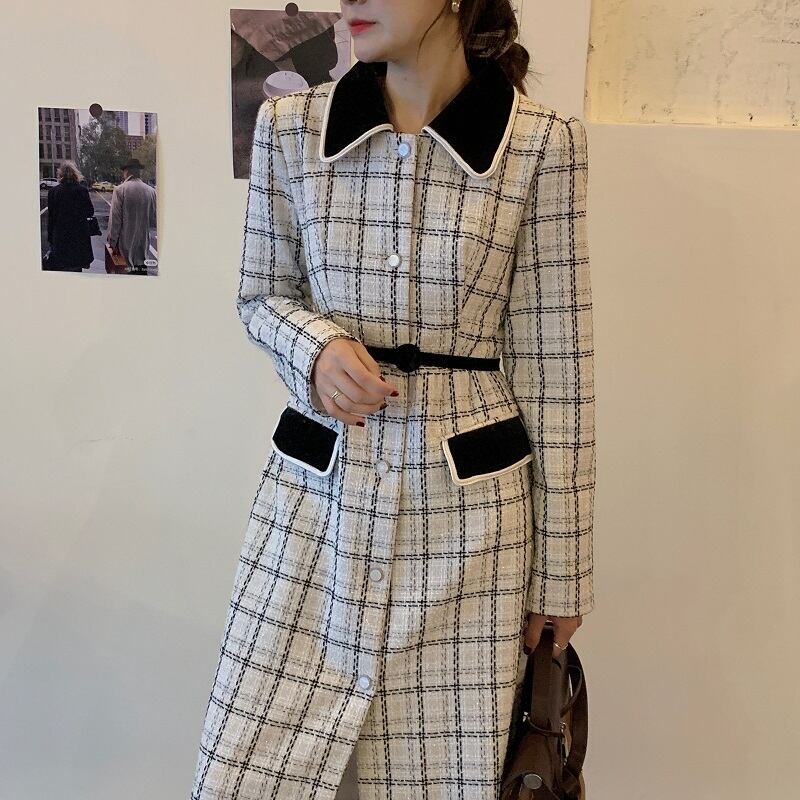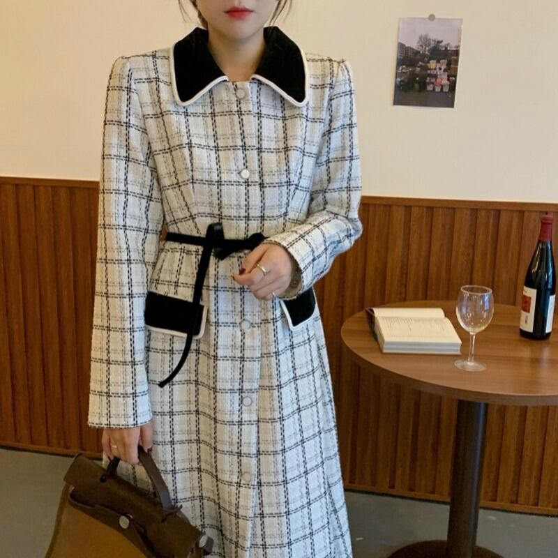 スタンダードカラーツィード格子柄ドレス オータムウィンター レトロ エレガント 秋物 冬物 韓国婦人72384998154