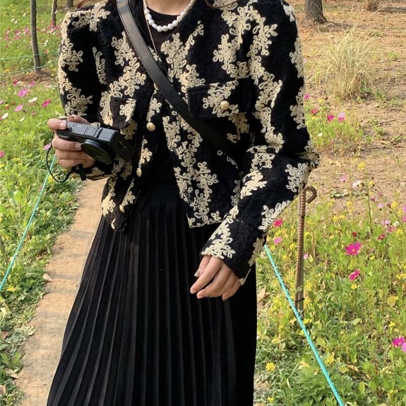 オータムウィンタースタンダードラウンドネックジャカードスリーブショートジャケット ハイウェストウェストプリーツスカート ロング レトロ 秋物 冬物 Oネック 韓国婦人62805363233