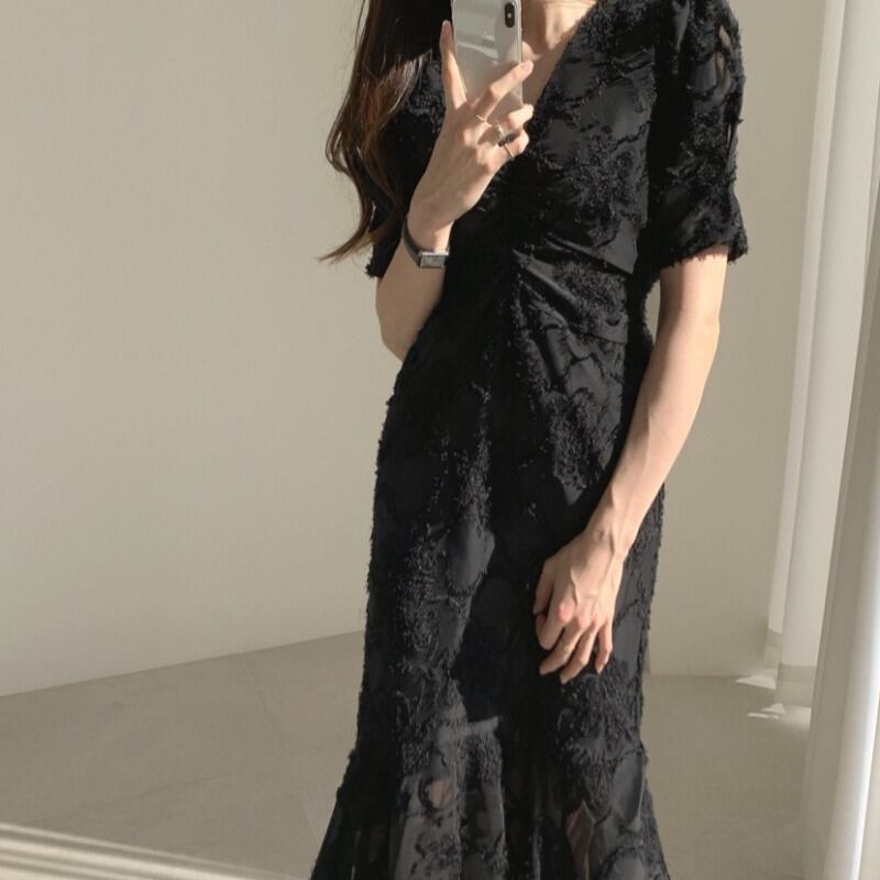 スタイルVネックプリーツウェストラッフルドレス ロングスカート レース エレガント レースアップ 韓国婦人8695230755
