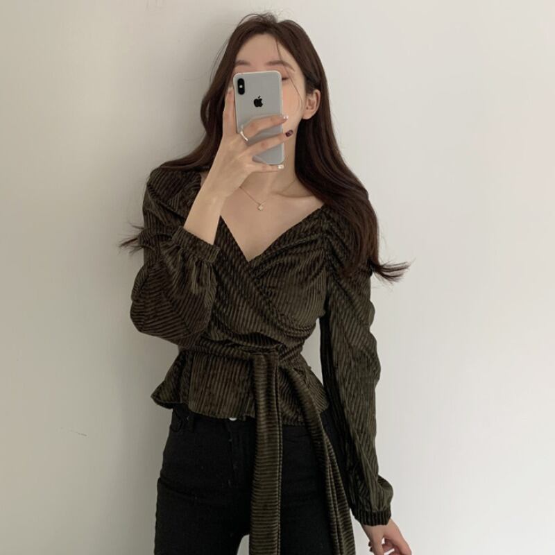 スプリングスタンダードVネックコーデュロイシャツ レディース ロング レトロ 春物 韓国婦人26754789470