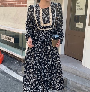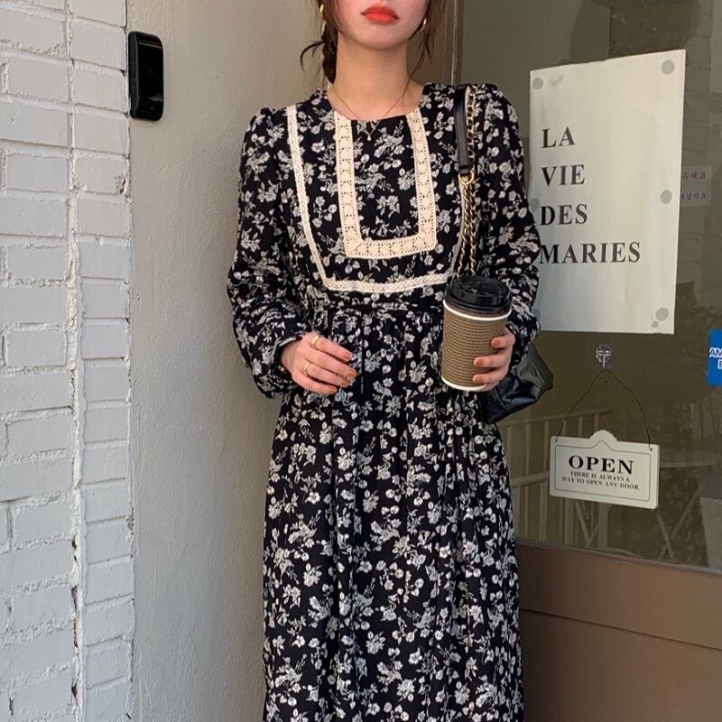スプリングレーススタイルスタンダードウェストフローラルドレス レディース ロング レトロ 春物 花柄 レースアップ ステッチ 韓国婦人9116027919