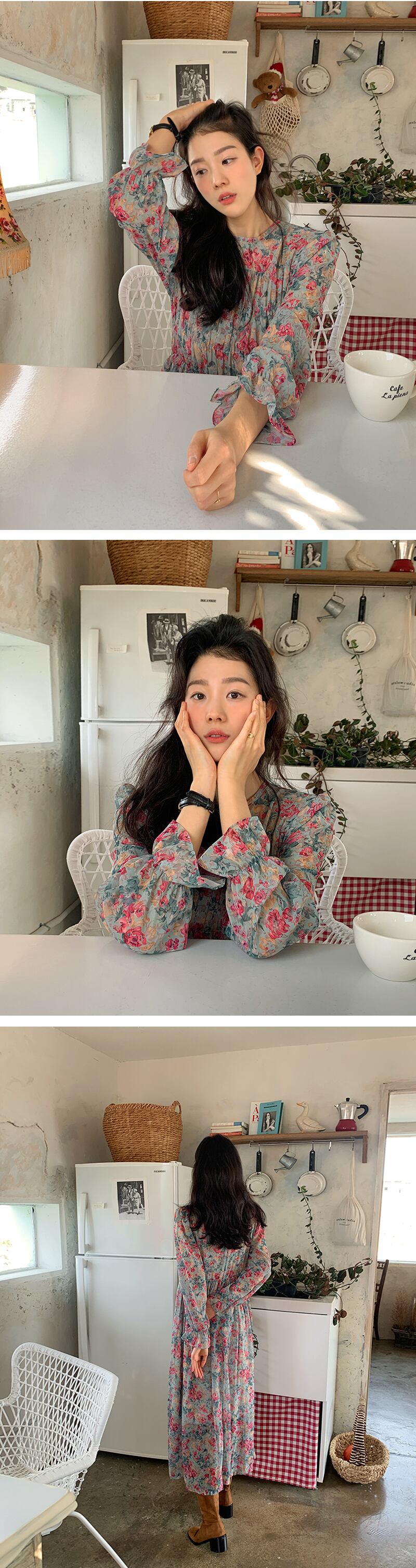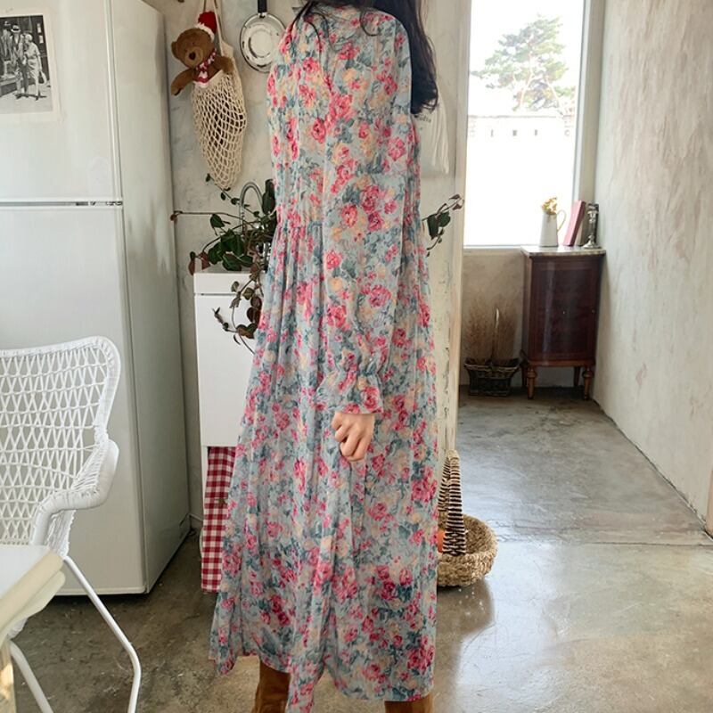 スプリングFlowerデザイン プリントラウンドネックウェストドレス レディース ロング エレガント 春物 Oネック フラワーデザイン 韓国婦人3052547320