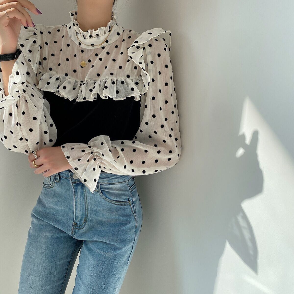 ラッフルシャツ レディーススプリングオータムスタイル水玉カラーベルベットトップス 春物 秋物 ステッチ 韓国婦人72286136179
