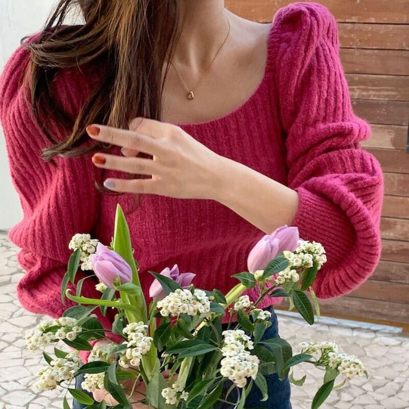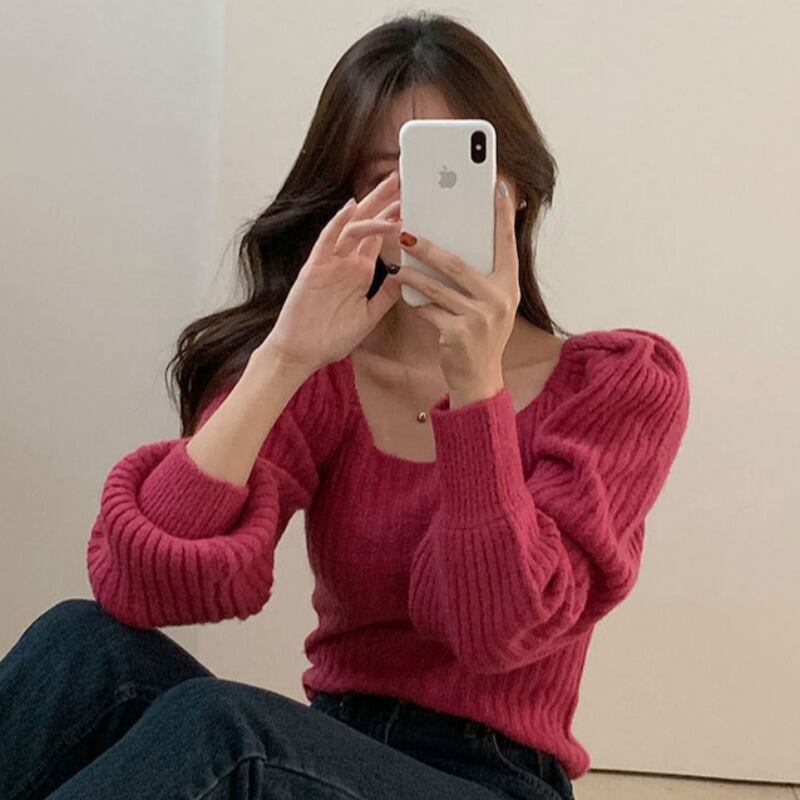 スリーブウェストソリッド カラーセーター スプリング ランタンスリーブ 春物 ソリッドカラー スクウェア 韓国婦人63012205172