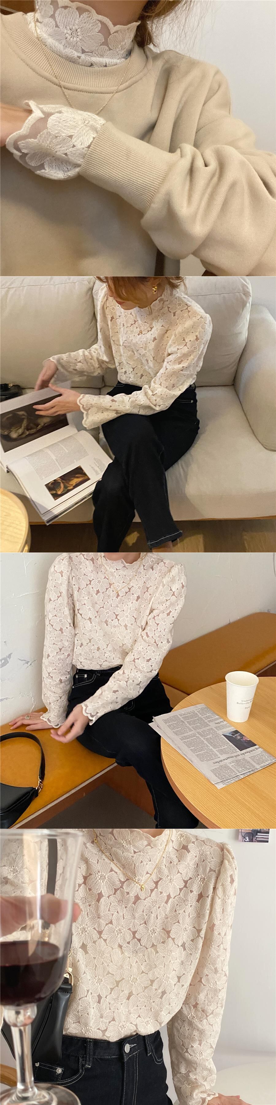 レーススプリングスリムシャツ ブラウス 刺繍 大人ガーリー スウィート キュート カジュアル 春物 フラワーデザイン 韓国婦人33935767892