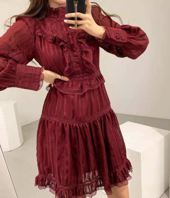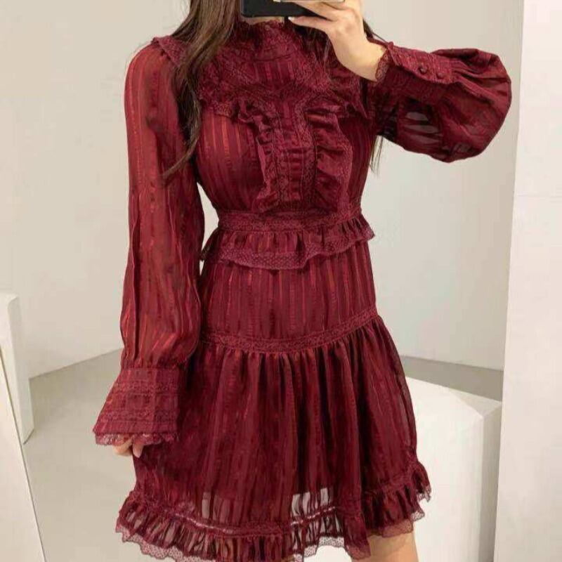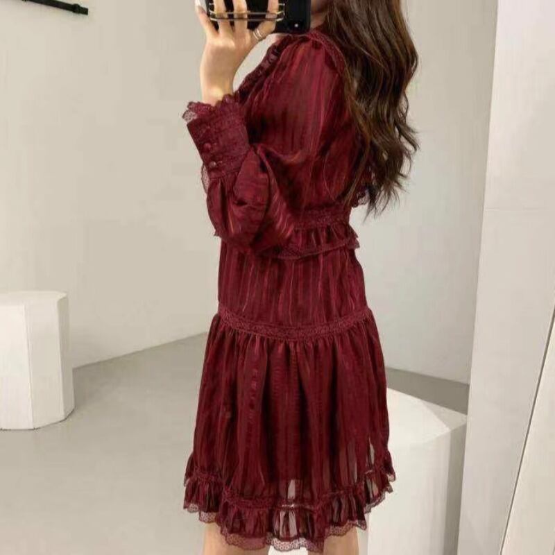 レーススタイルスプリングレッド長袖スリーブドレス ロング 春物 韓国婦人66660557155