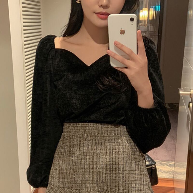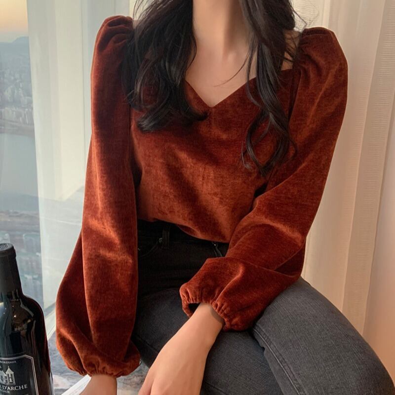 スタンダードシャツ カラーベルベットオータムウィンタートップス ロング レトロ 秋物 冬物 スクウェア 韓国婦人57344910597