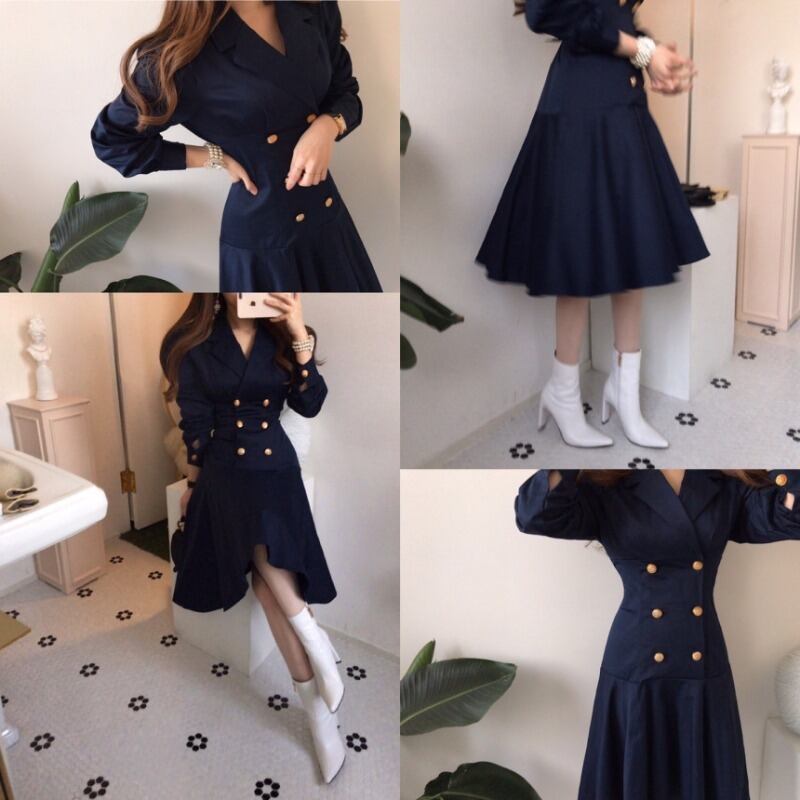 オータムウィンターダブルブレストスリムプリーツスカート ドレス エレガント 秋物 冬物 韓国婦人4623284008