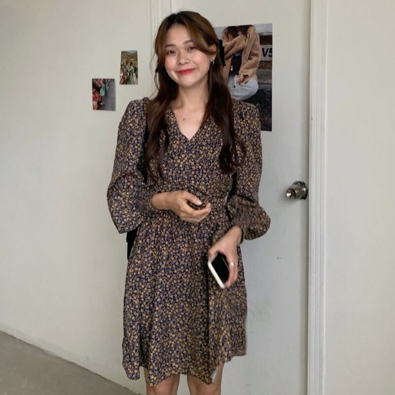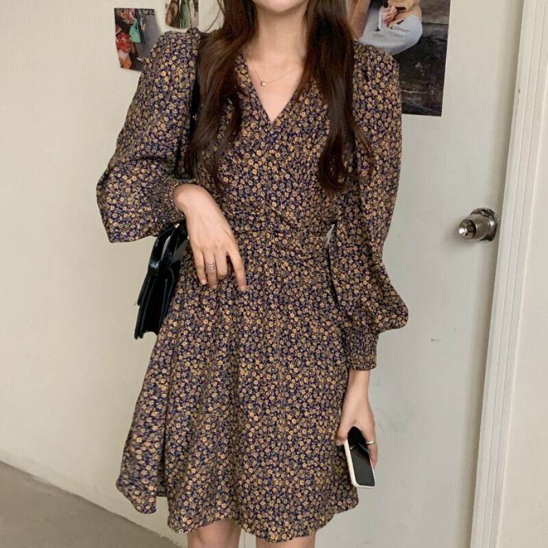 スプリングスタンダードショート薄手スリーブフローラルドレス レトロ 春物 花柄 スカート 韓国婦人77304359491