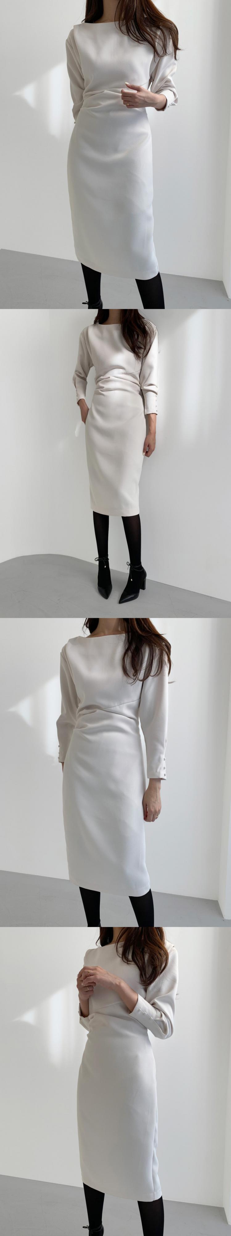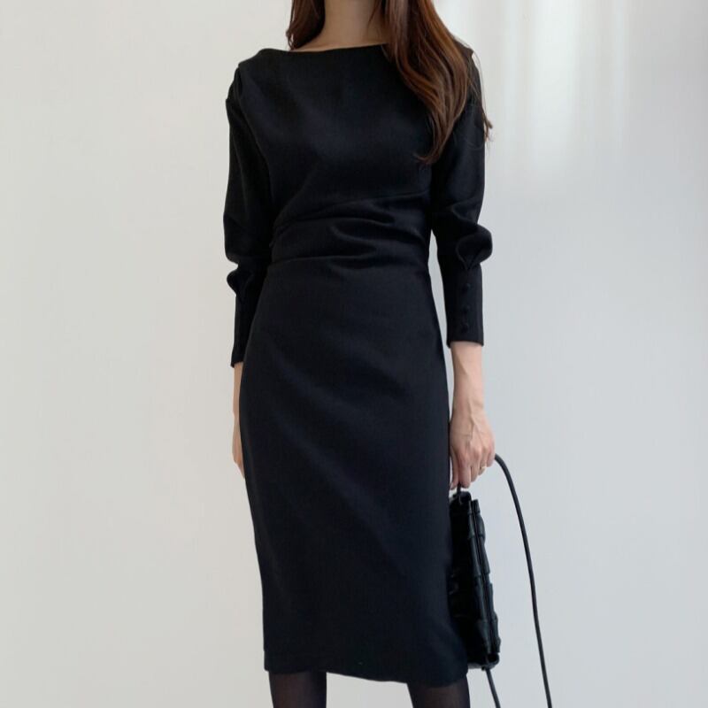 スプリングラウンドネックウェストスリムロングドレス 長袖 春物 スリムヒップ Oネック 韓国婦人16594195007