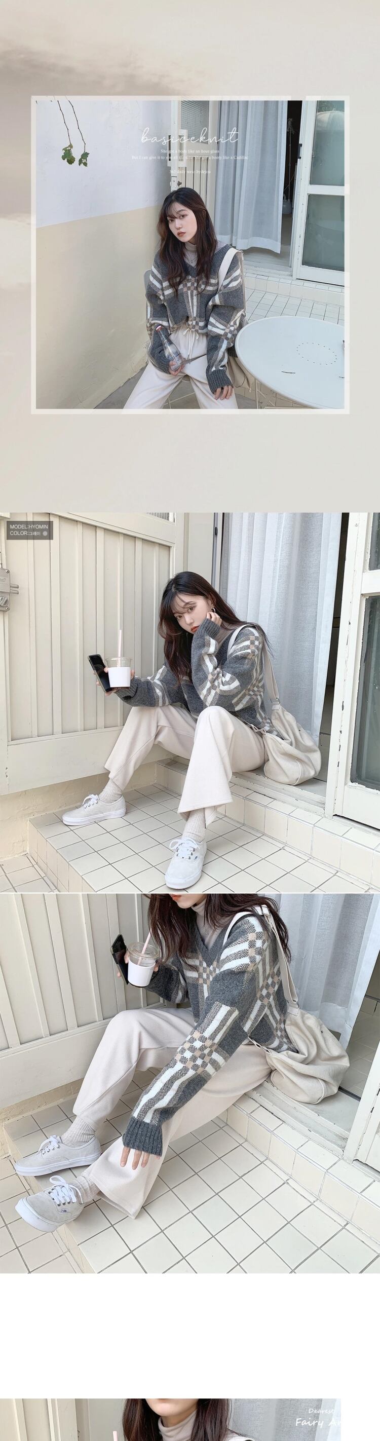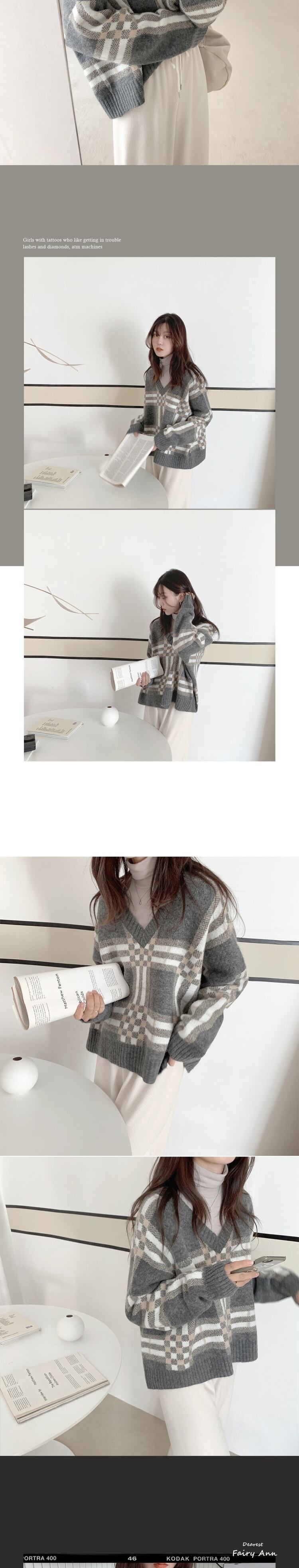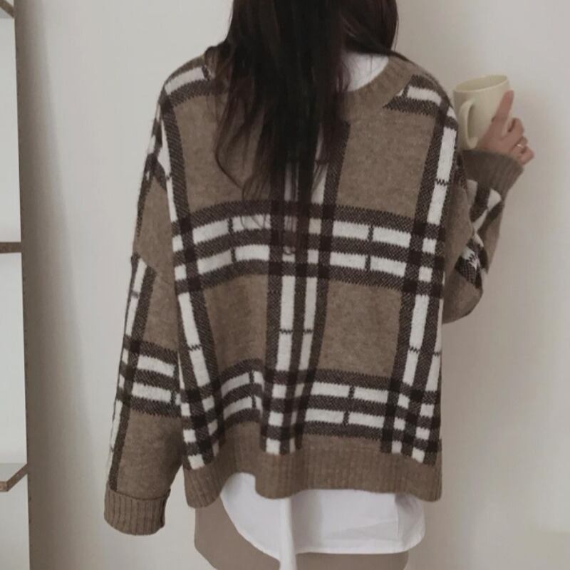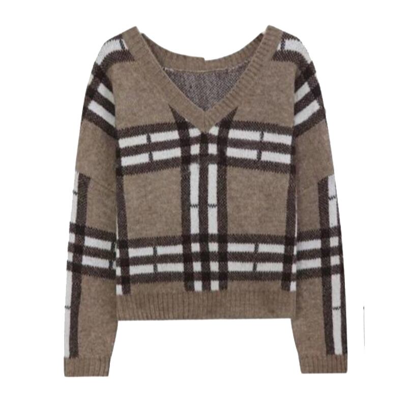 オータムウィンタースタイルスタンダードVネックカラー格子柄プルオーバー セーター レディースルーズニットトップス レトロ 秋物 冬物 韓国婦人50283880502