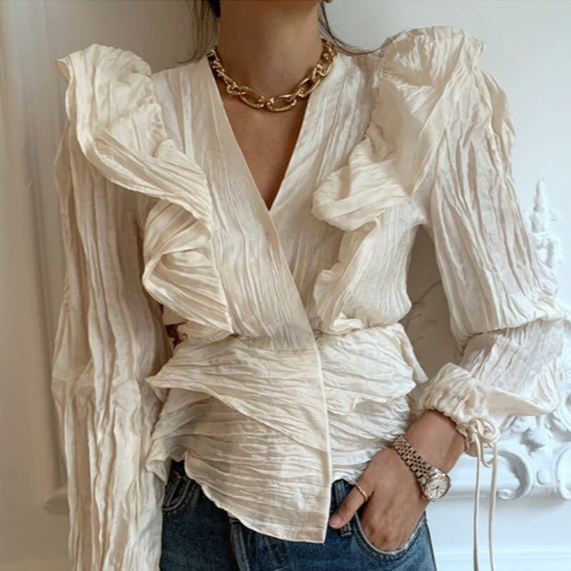 スプリングスタイルVネックラッフル薄手ウェストシャツ レディース ロング レース 春物 ステッチ 韓国婦人15366978070
