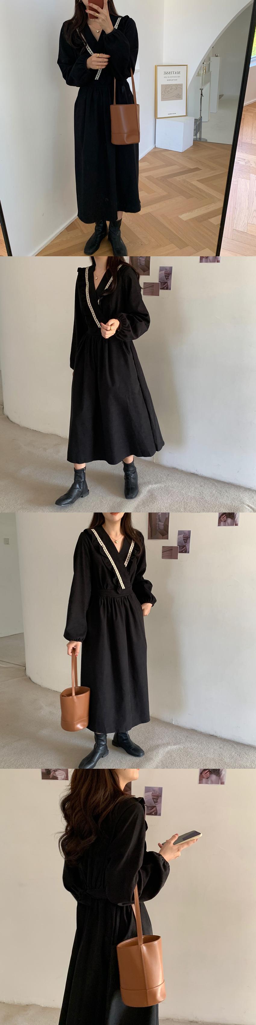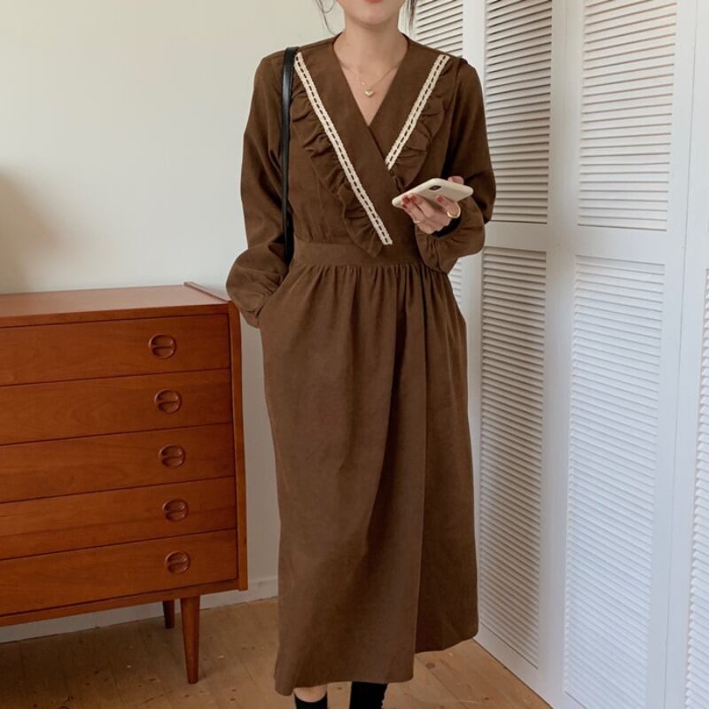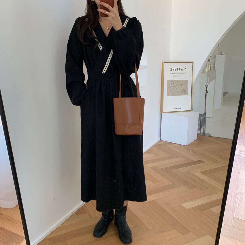 スプリングオータムスリムロングドレス Vネックウェストスタンダードブラック レトロ 春物 秋物 韓国婦人86694442597