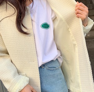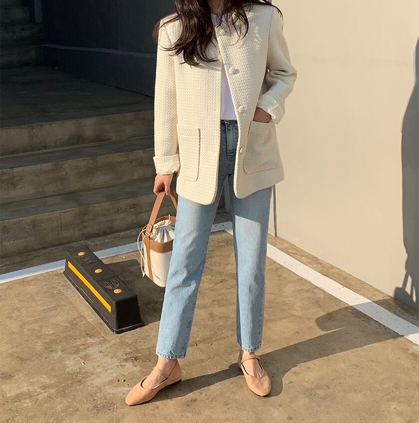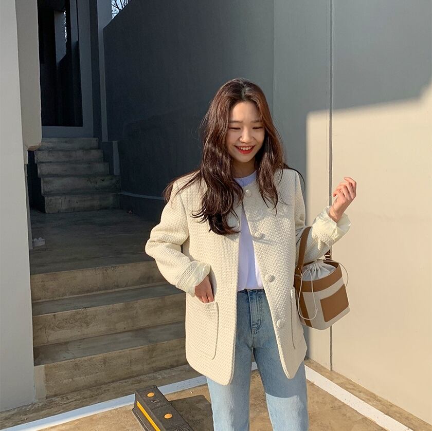 スプリングオータムツィードダブルラウンドネック長袖スリーブシングルブレストルーズホワイトジャケット レディース ロング 春物 秋物 Oネック 韓国婦人98559873112